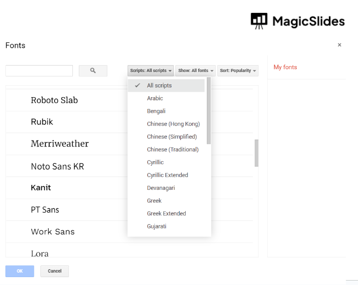 The "More fonts" window provides an extensive collection of fonts for you to choose from. Here, you can manage the fonts used in your presentation and explore the available options.