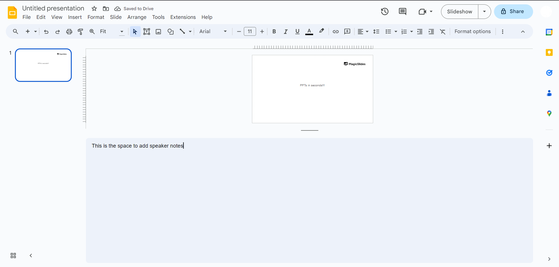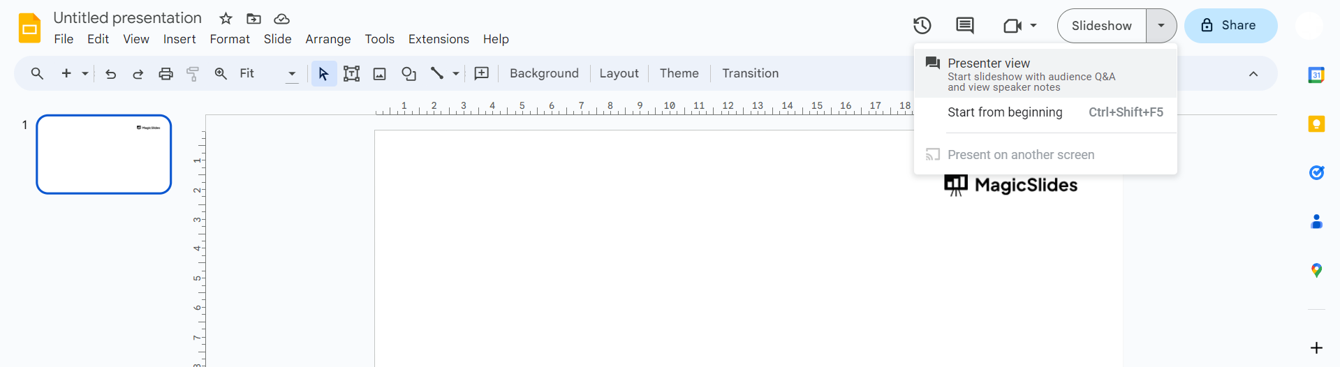 Begin by opening your Google Slides presentation. Click on the "Present" button to enter the full-screen mode.