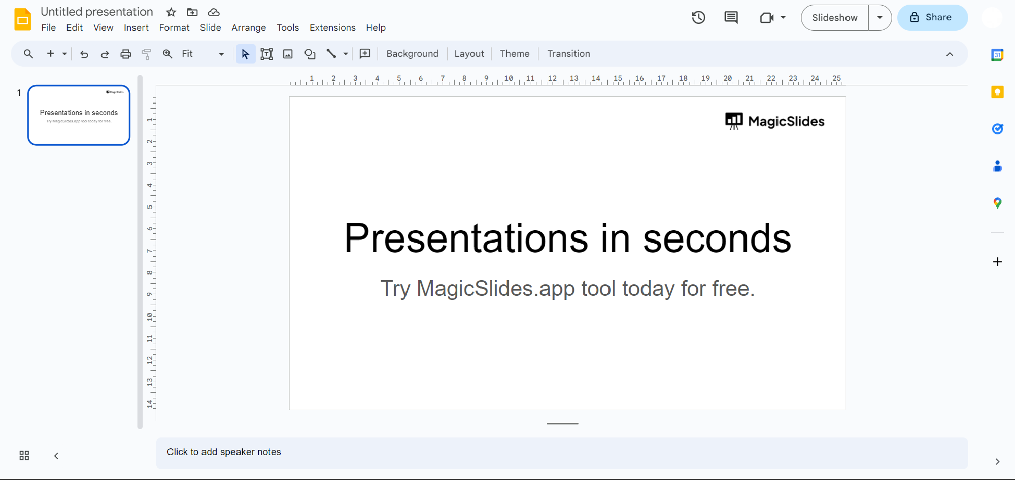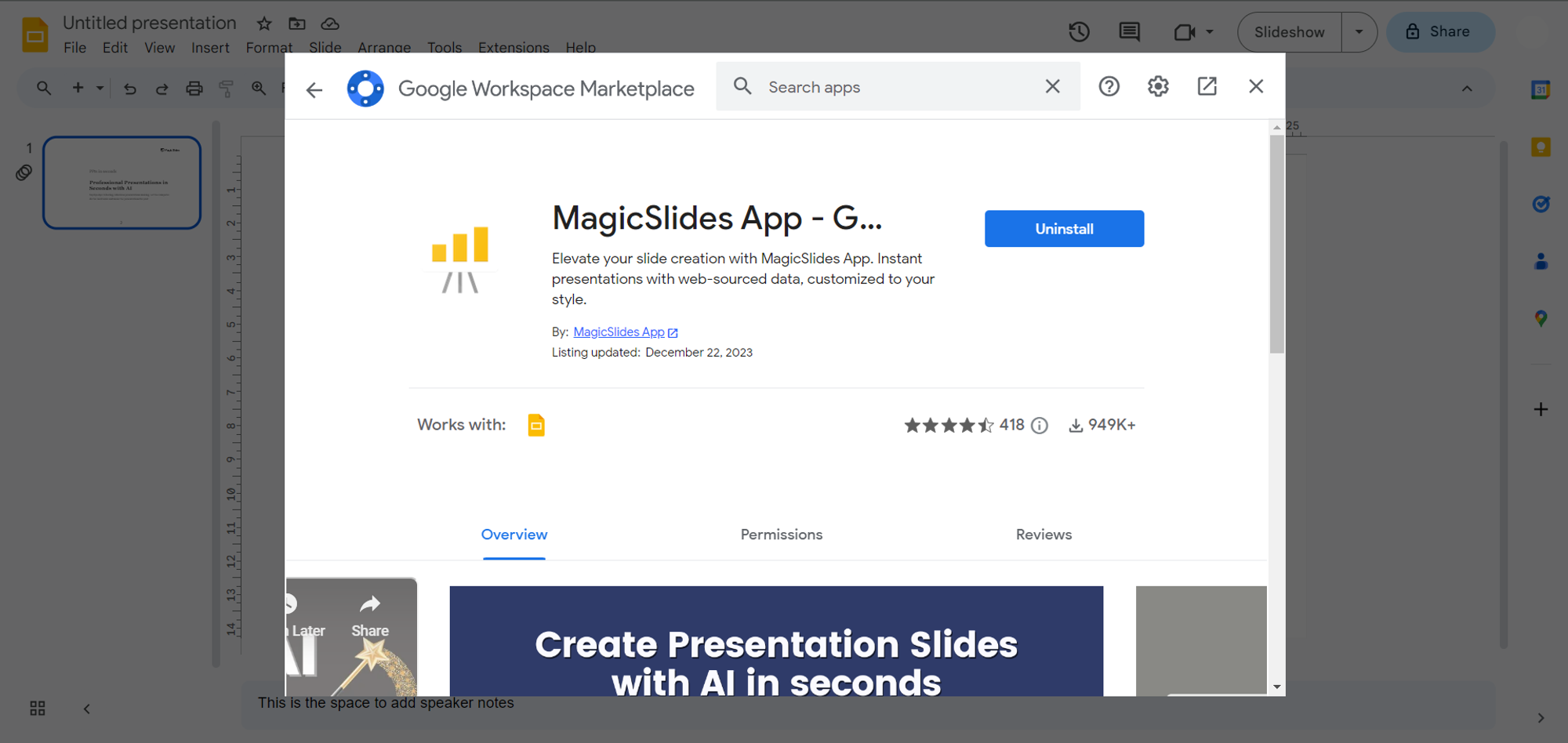 If not, visit the Extensions Marketplace, search for "MagicSlides.app," and download the extension to enhance your Google Slides capabilities.
