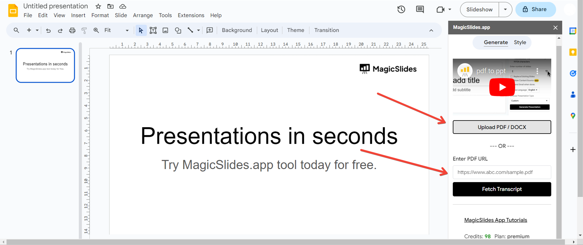With your research paper ready, return to Google Slides and open MagicSlides. Upload your research paper file, signaling the beginning of the conversion process.