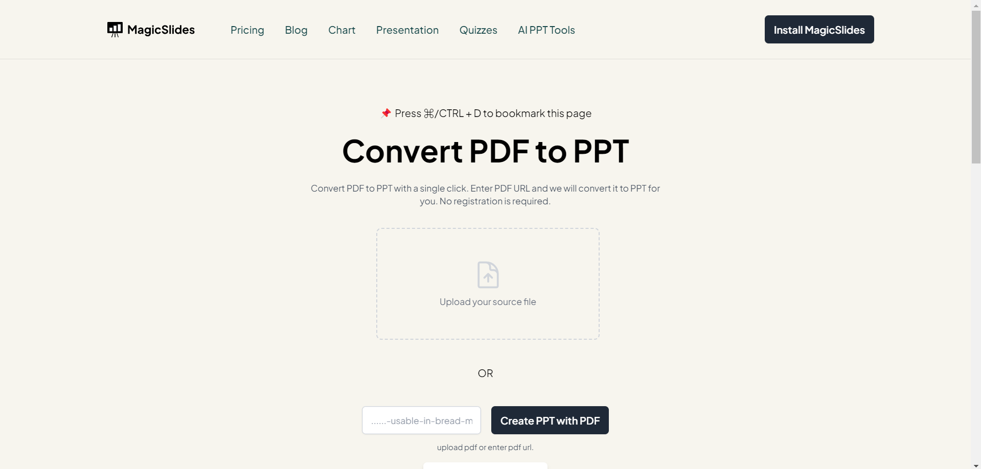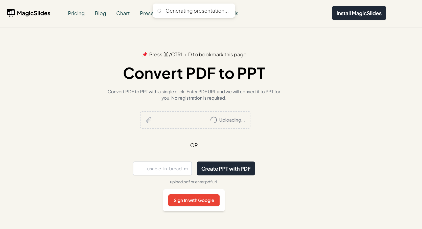 Before diving into the conversion process, select a reliable PDF to PowerPoint converter. Various online tools and software options are available, each offering unique features. Opt for one that aligns with your specific needs, ensuring a smooth and accurate transformation. You can choose MagicSlides.app’s flagship AI PPT converter tool to turn your PDF to PPT. Access using the link: https://www.magicslides.app/tools/pdf-to-ppt
