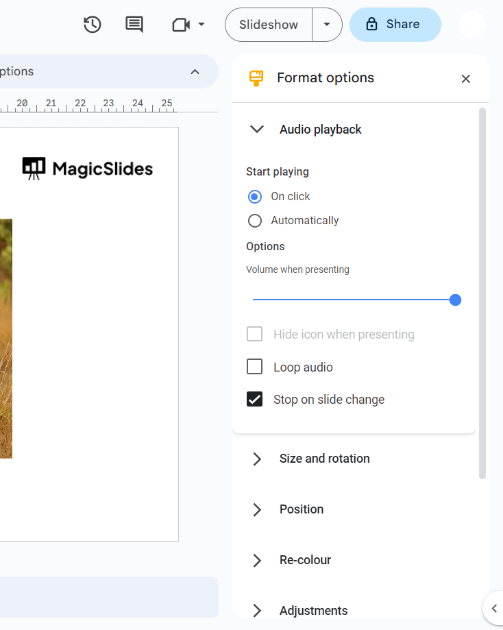Click on the audio icon to select it. Upon selection, you can access a set of basic formatting options that allow you to adjust how the audio functions and appears within your presentation.