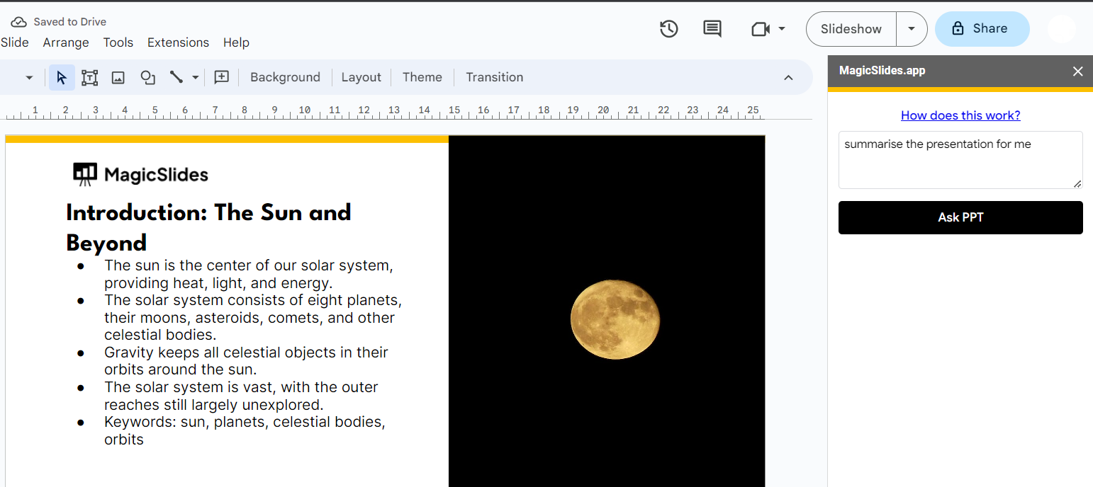 Lastly, MagicSlides facilitates data-driven decision-making with its "Ask PPT" feature. Professionals can easily extract key insights and summaries from their existing presentations, simplifying complex information. In today's fast-paced world, where both time and quality are paramount, MagicSlides empowers individuals and teams to deliver compelling presentations effortlessly. Whether you're in sales, marketing, education, or any field demanding impactful presentations, MagicSlides ensures your message shines. Experience the magic of efficient, impactful presentations with MagicSlides today.