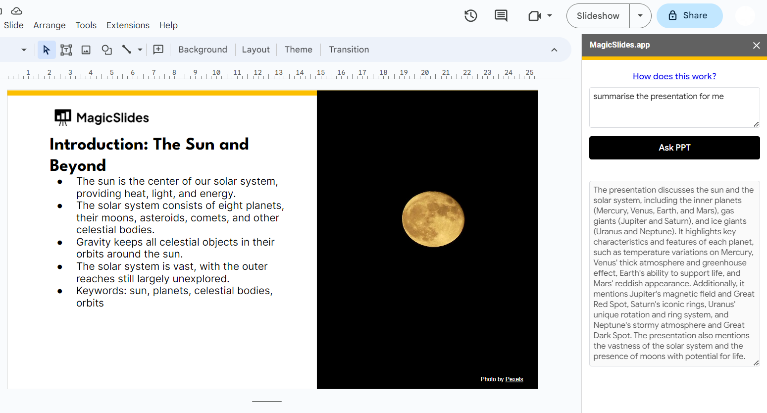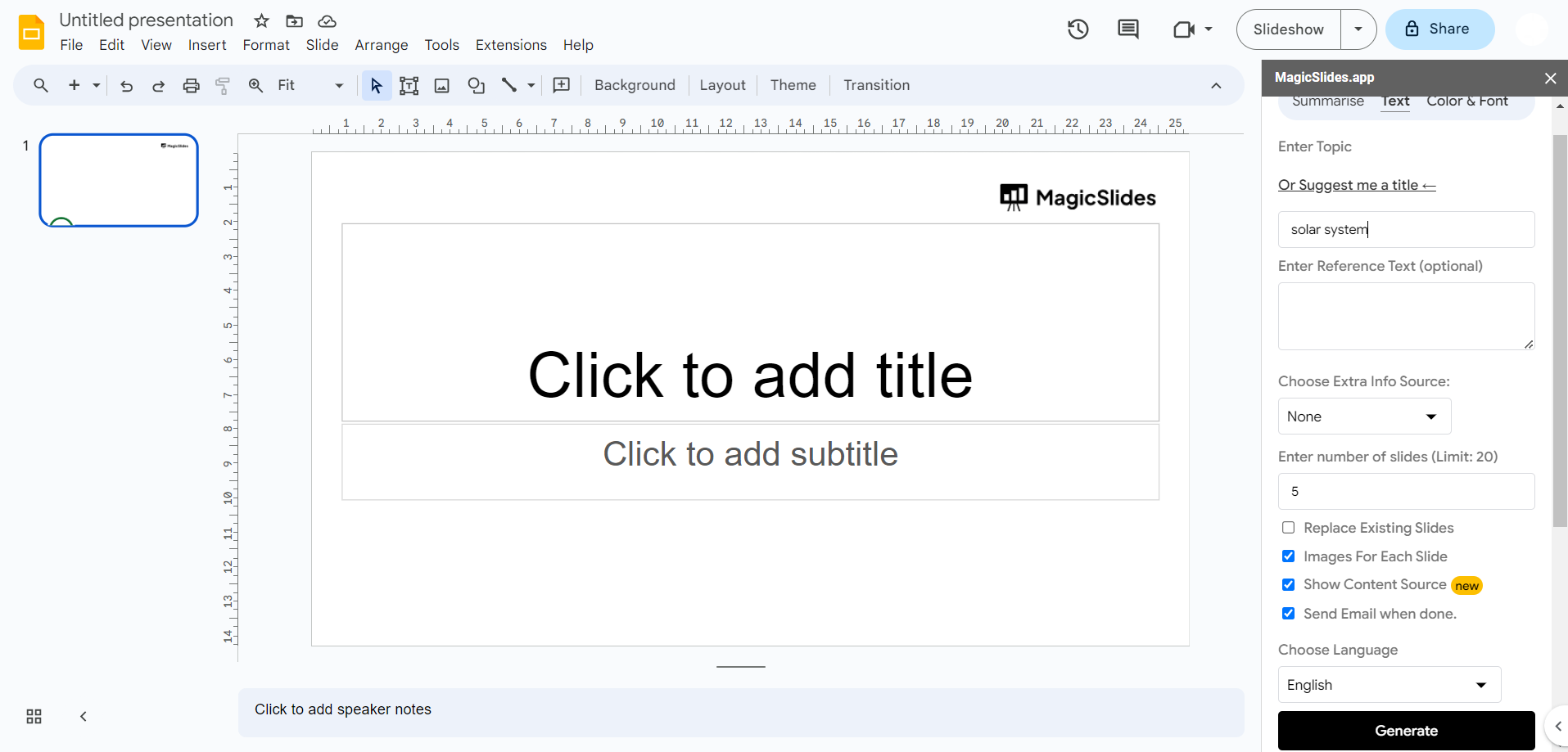 - Click "Generate," and MagicSlides will provide you with an answer or summary in no time.