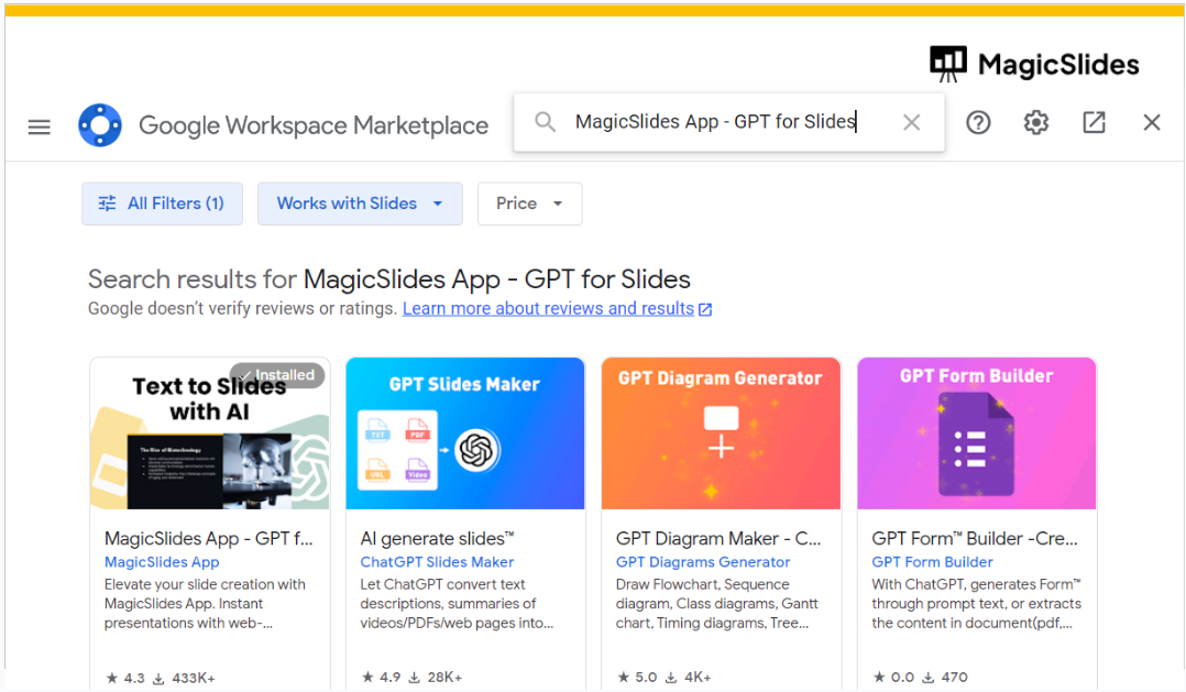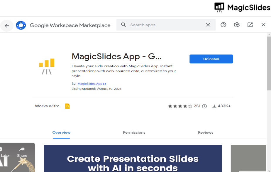 - Search for MagicSlides: In the Extensions Marketplace, use the search bar to look for "MagicSlides."