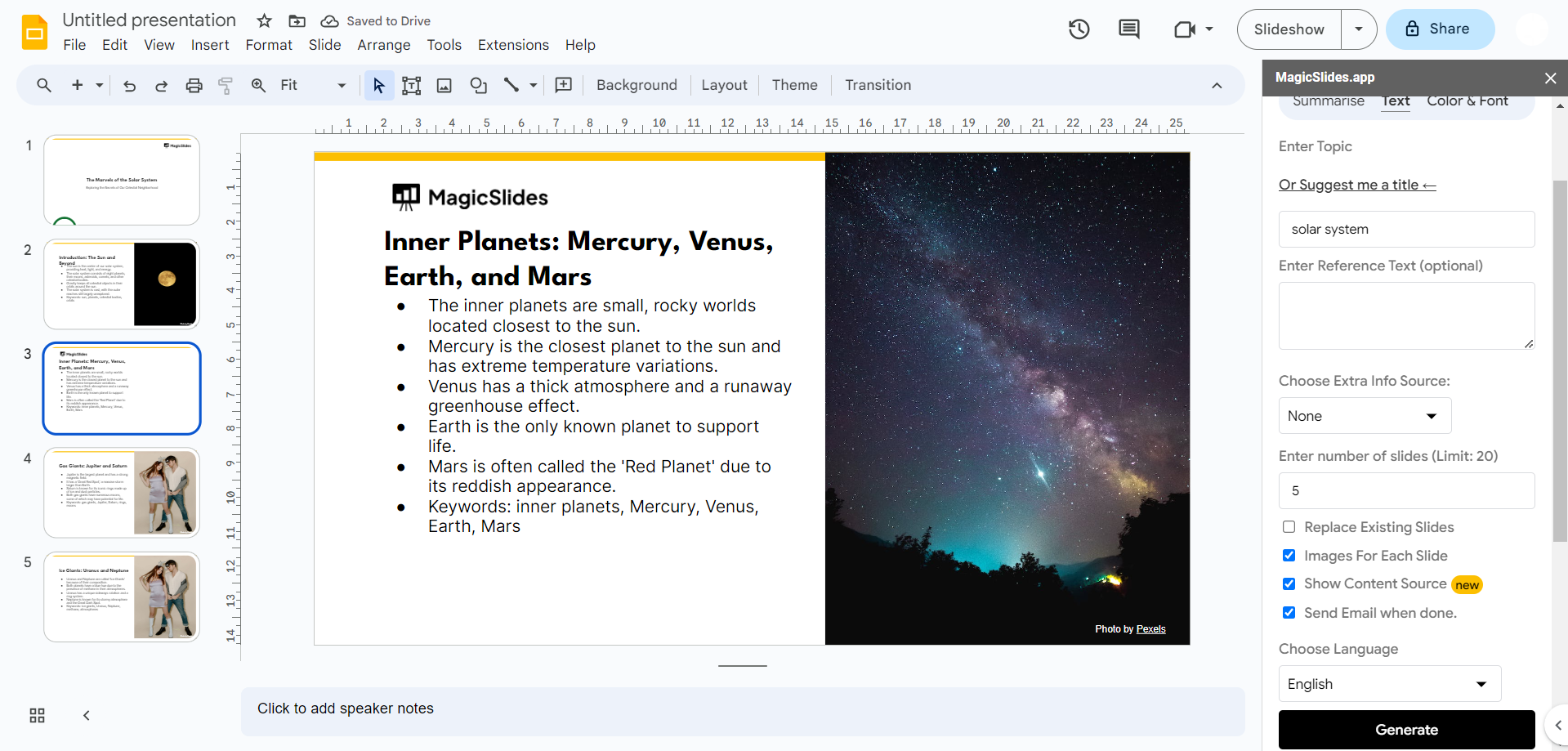 - Click "Generate," and your presentation will be ready shortly.