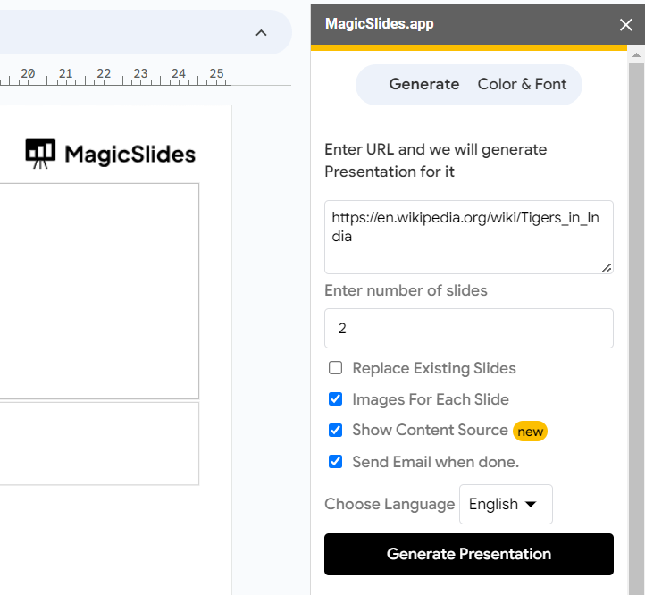 What sets MagicSlides apart is its efficiency. Once you've set your preferences, you can sit back and relax while the app handles the heavy lifting. MagicSlides not only creates your presentation but can also notify you via email when it's ready, ensuring you're always in the loop.