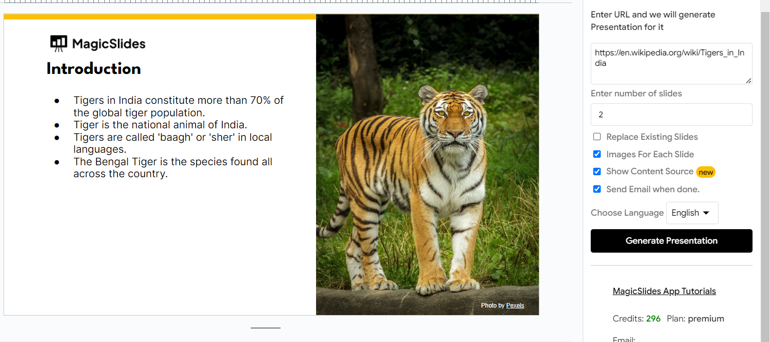 MagicSlides offers flexibility in tailoring your presentation to your exact requirements. You can specify the number of slides you need, provide reference text to guide the content creation, and even add additional reference sources for richer, more accurate information. You have the choice to include images on each slide, enhancing visual appeal, and decide whether or not to show the content source, maintaining transparency in your presentation.