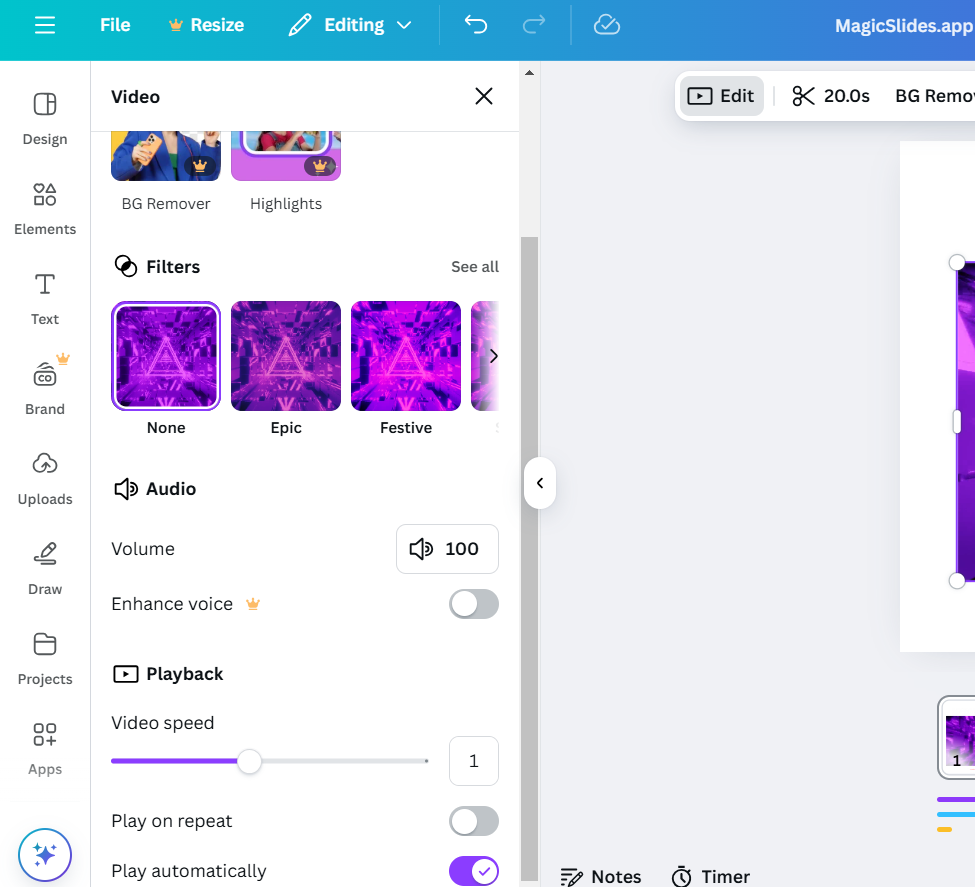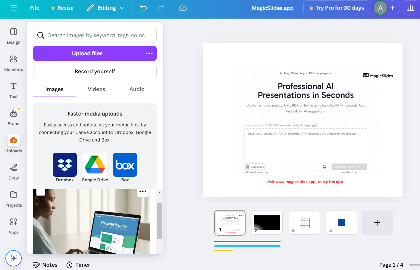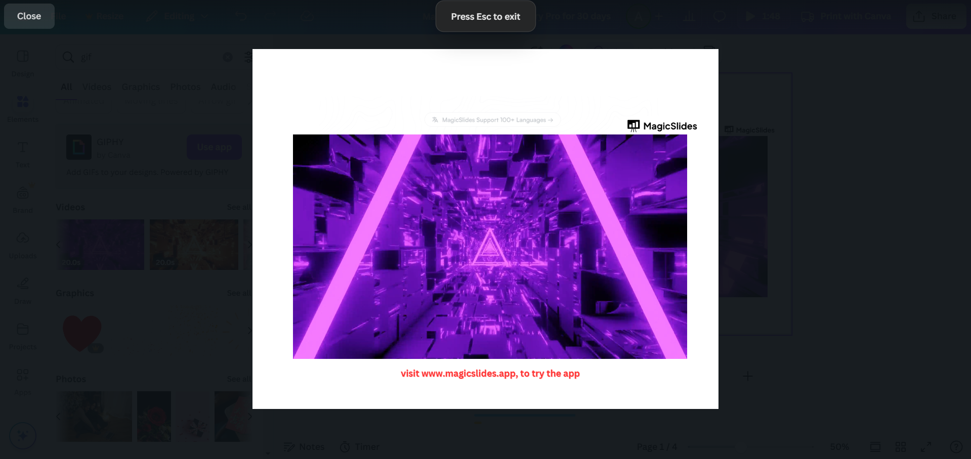 Looping a GIF in Canva Slides is possible! But why stop there? With MagicSlides.app, you can create professional, dynamic presentations effortlessly, adding features like animations, videos, and more to elevate your slides in seconds.