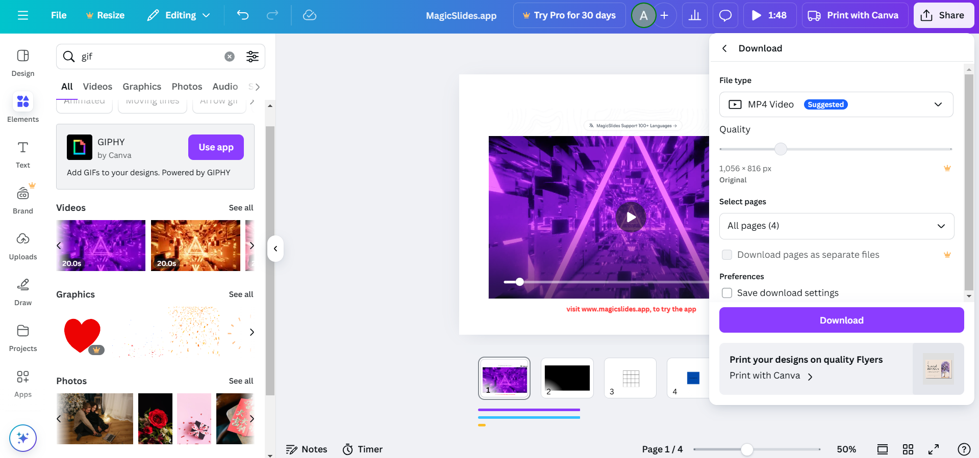 Alternatively, search for GIFs in Canva’s library by going to Elements > GIFs and picking one.