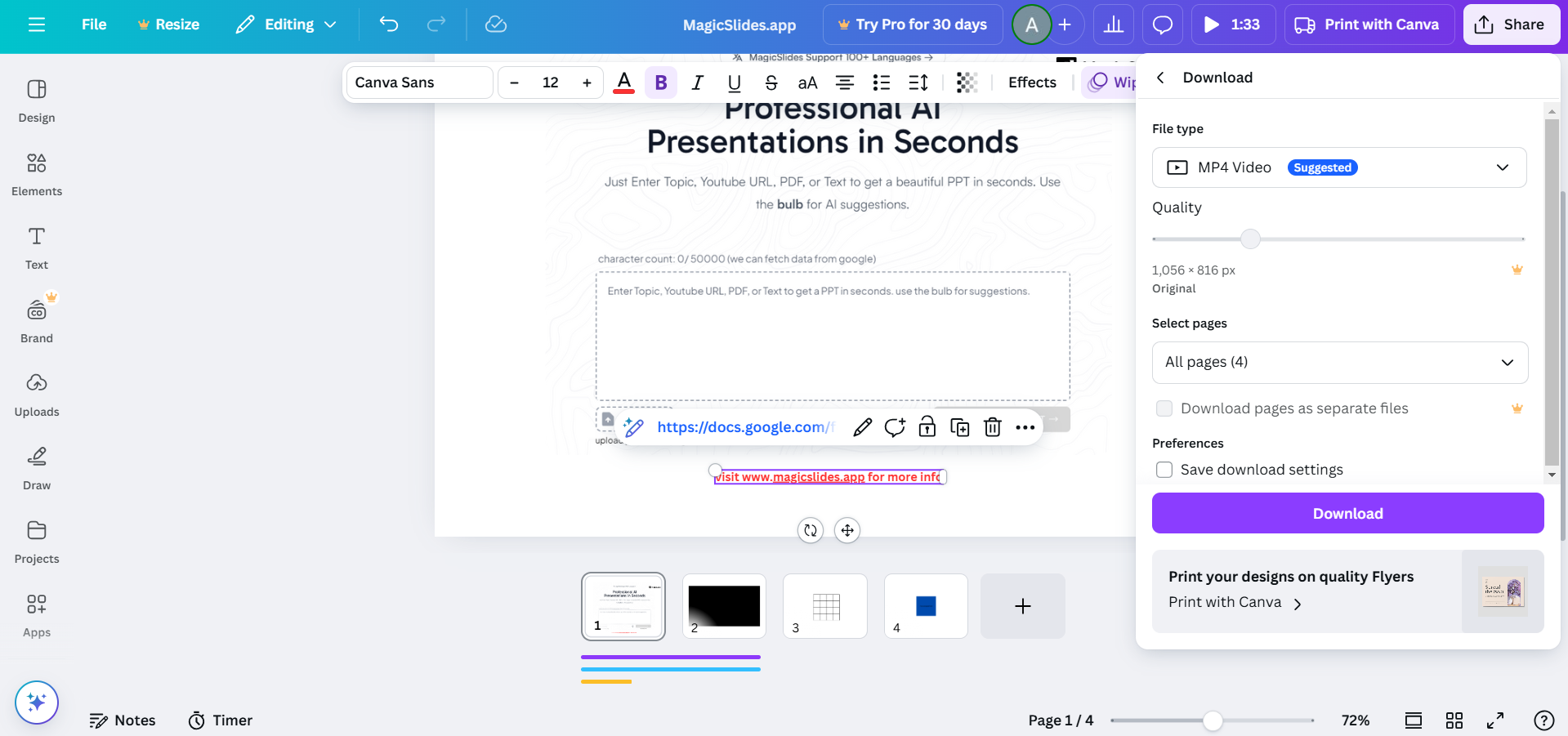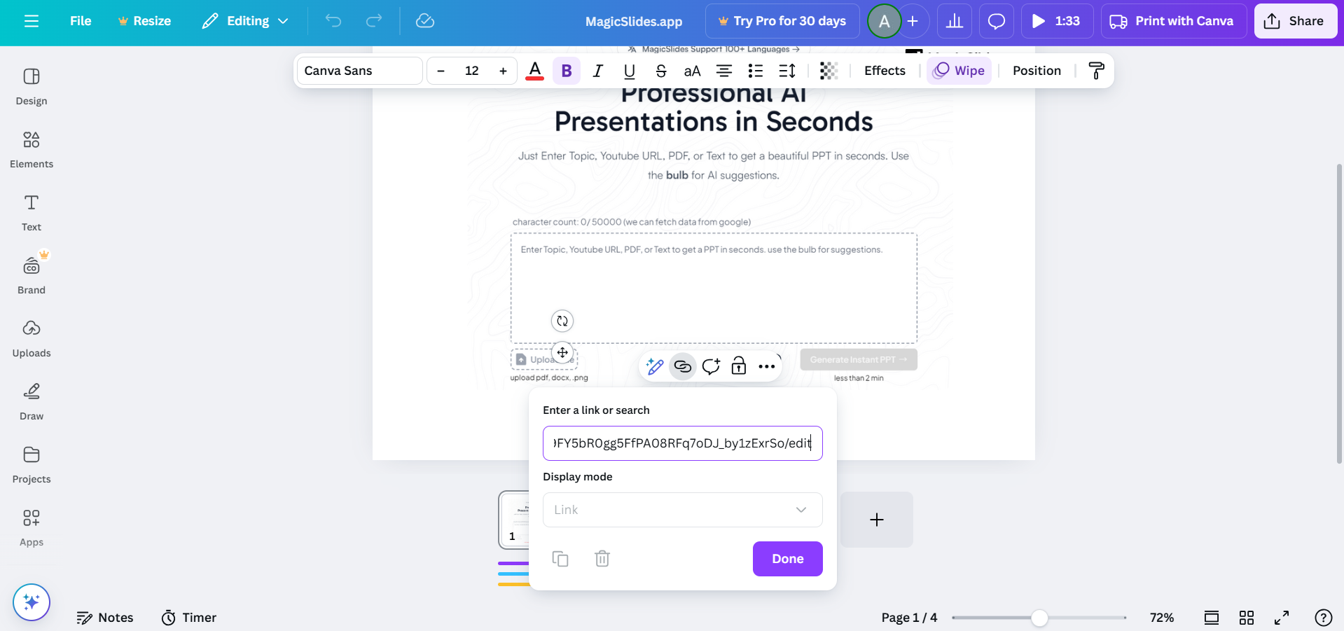 Embedding forms on a Canva website is possible, but if you need a smarter way to generate presentations, try MagicSlides.app. Convert topics, PDFs, and even YouTube videos into stunning slides instantly!