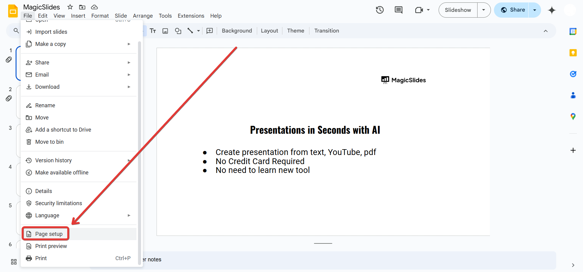 Click on File in the top menu. Scroll down and select Page setup from the dropdown menu.