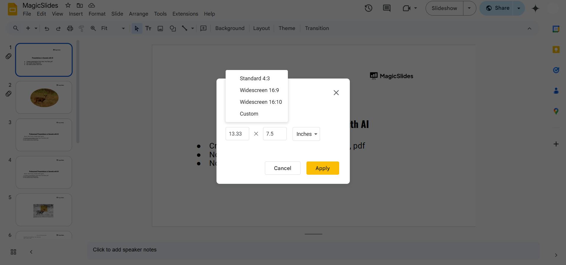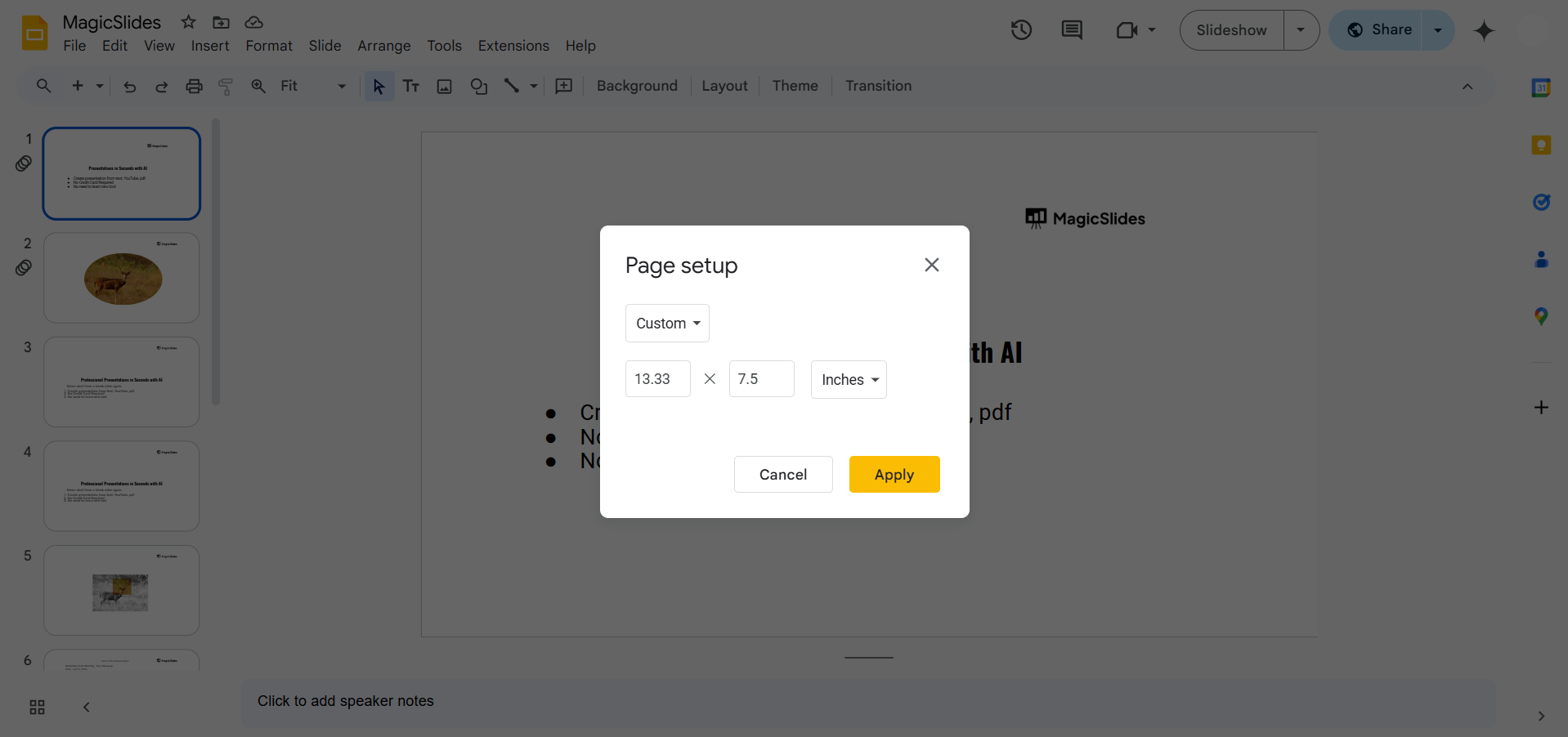 Enter your desired dimensions (e.g., 1080 x 1920 pixels for a vertical slide). Click Apply to save the changes.