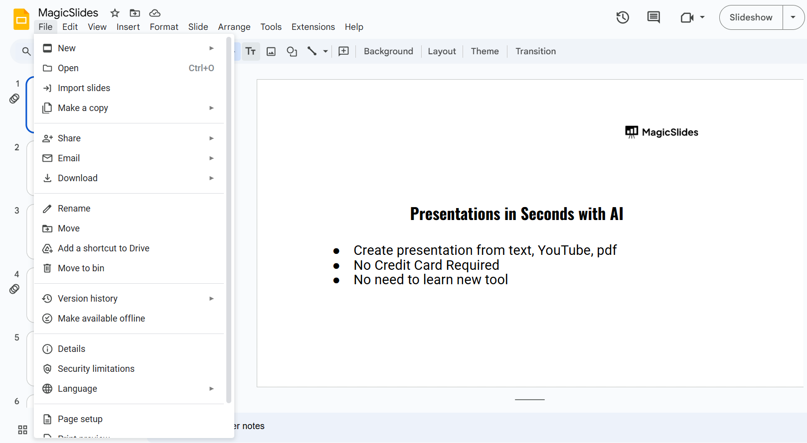 - Once the presentation opens, click File → Save as Google Slides.