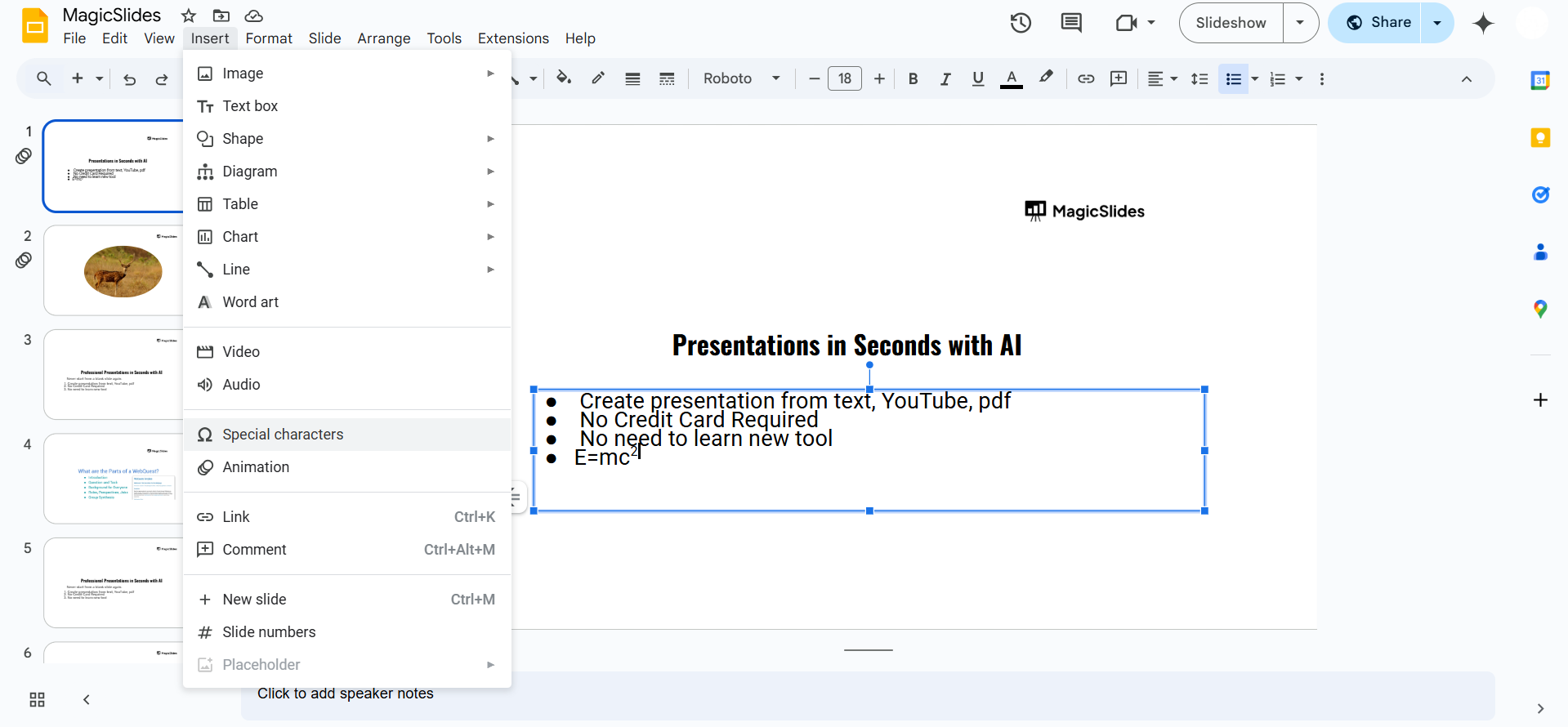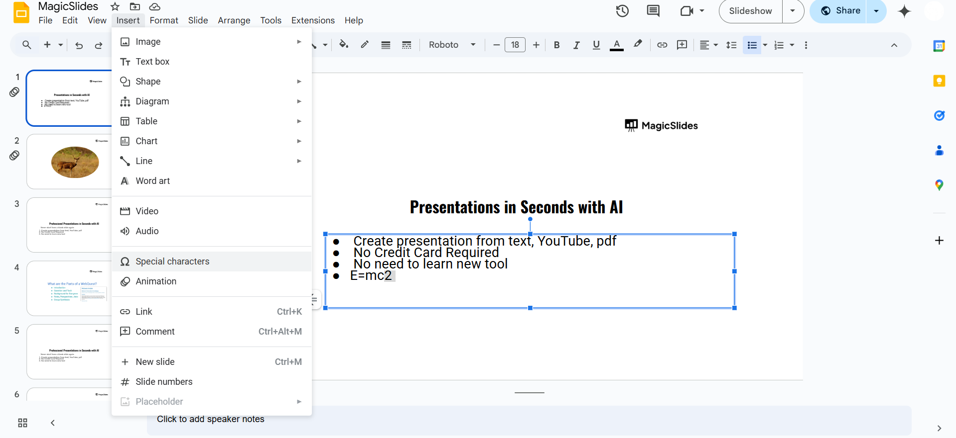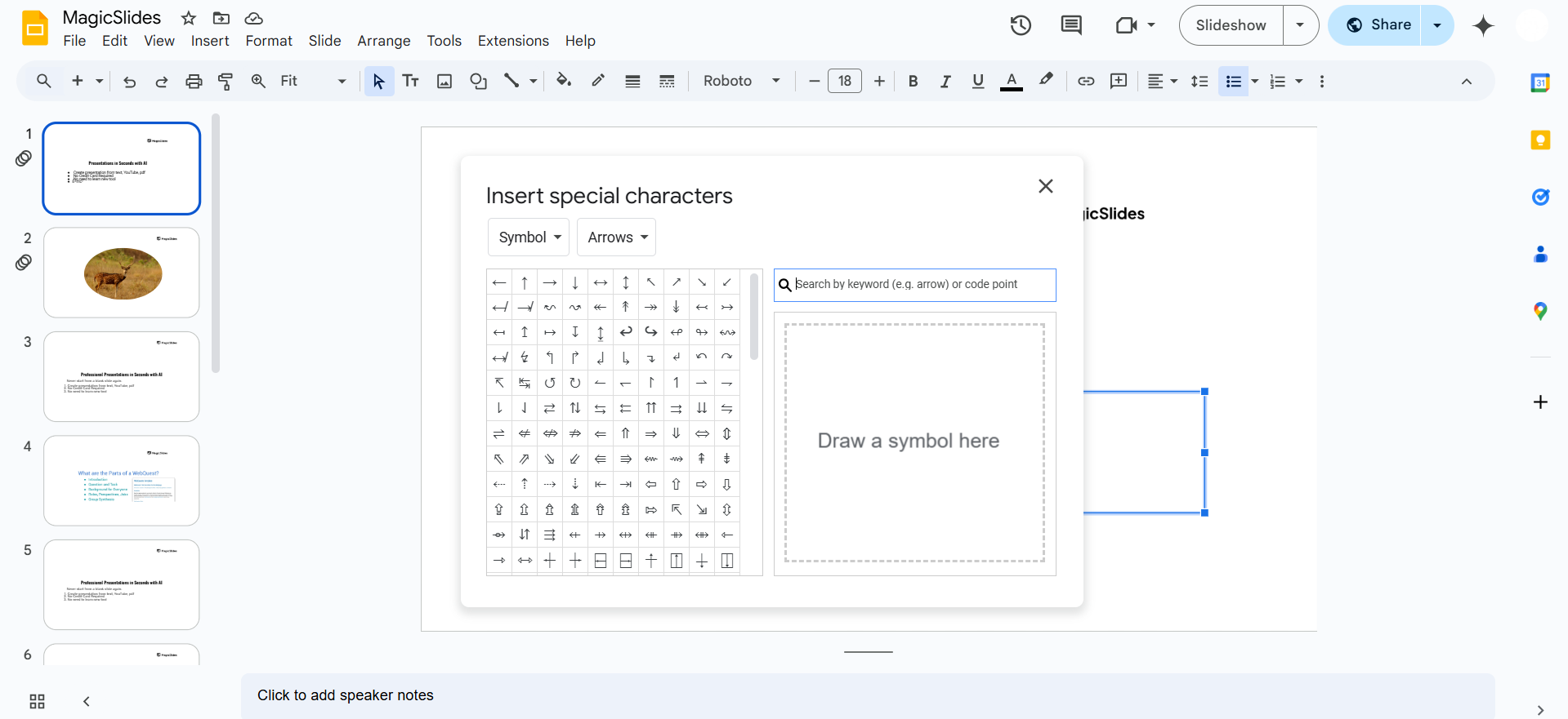 Click on the desired character to insert it into your slide.
