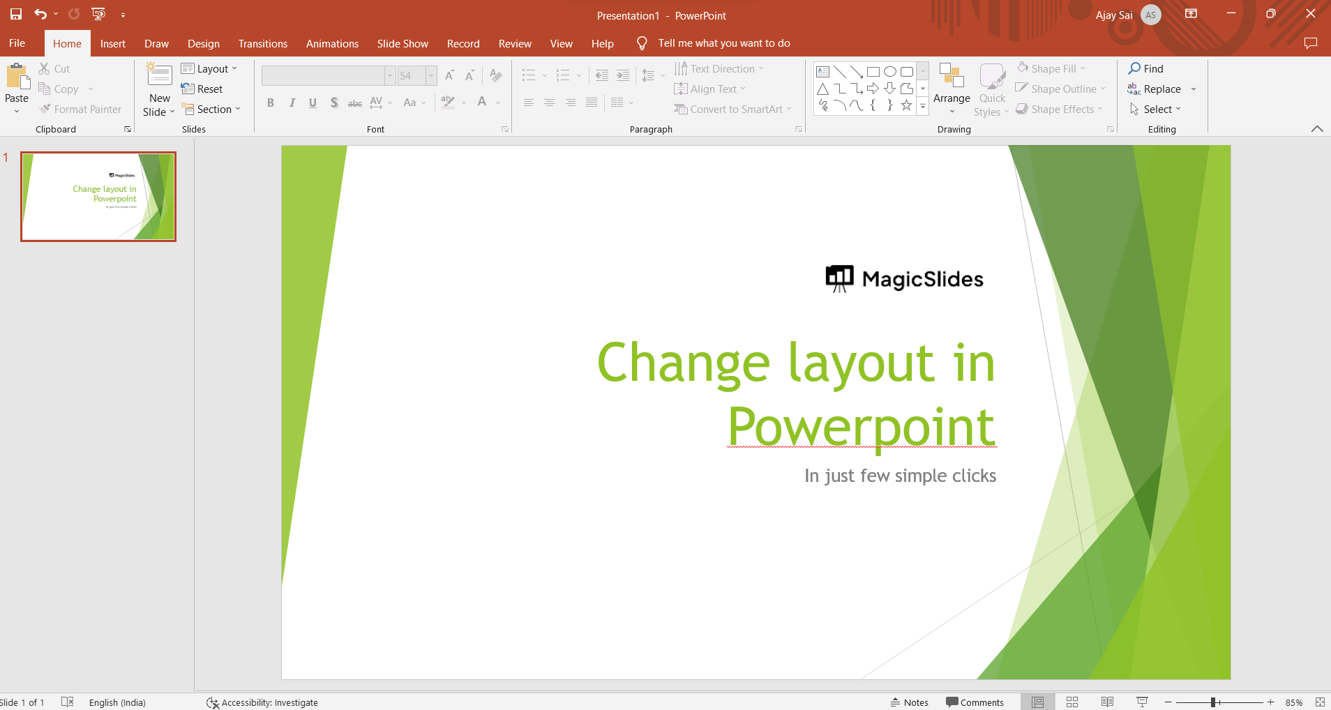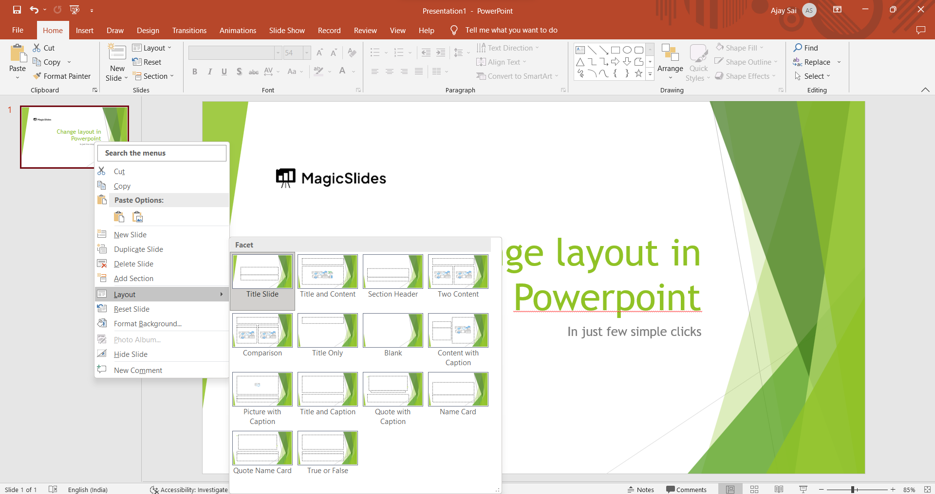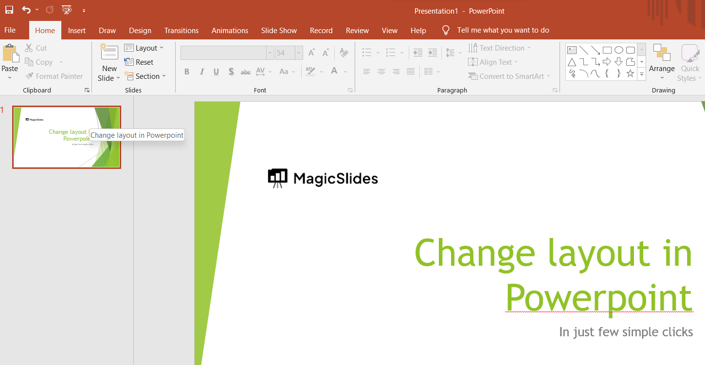 In Microsoft PowerPoint, you can change the layout of a slide to switch between different predefined formats for arranging content, such as title slides, content slides, picture slides, etc. Here's how you can change the layout of a slide: