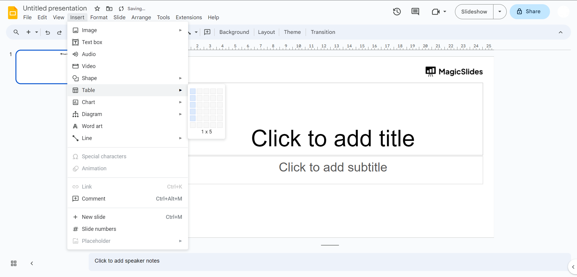 Step 4: Choose Columns: After clicking "Table," a grid will appear over your slide. Hover your cursor over the grid until you see a highlighted rectangle indicating the number of columns and rows. Click and drag to select the number of columns you want.