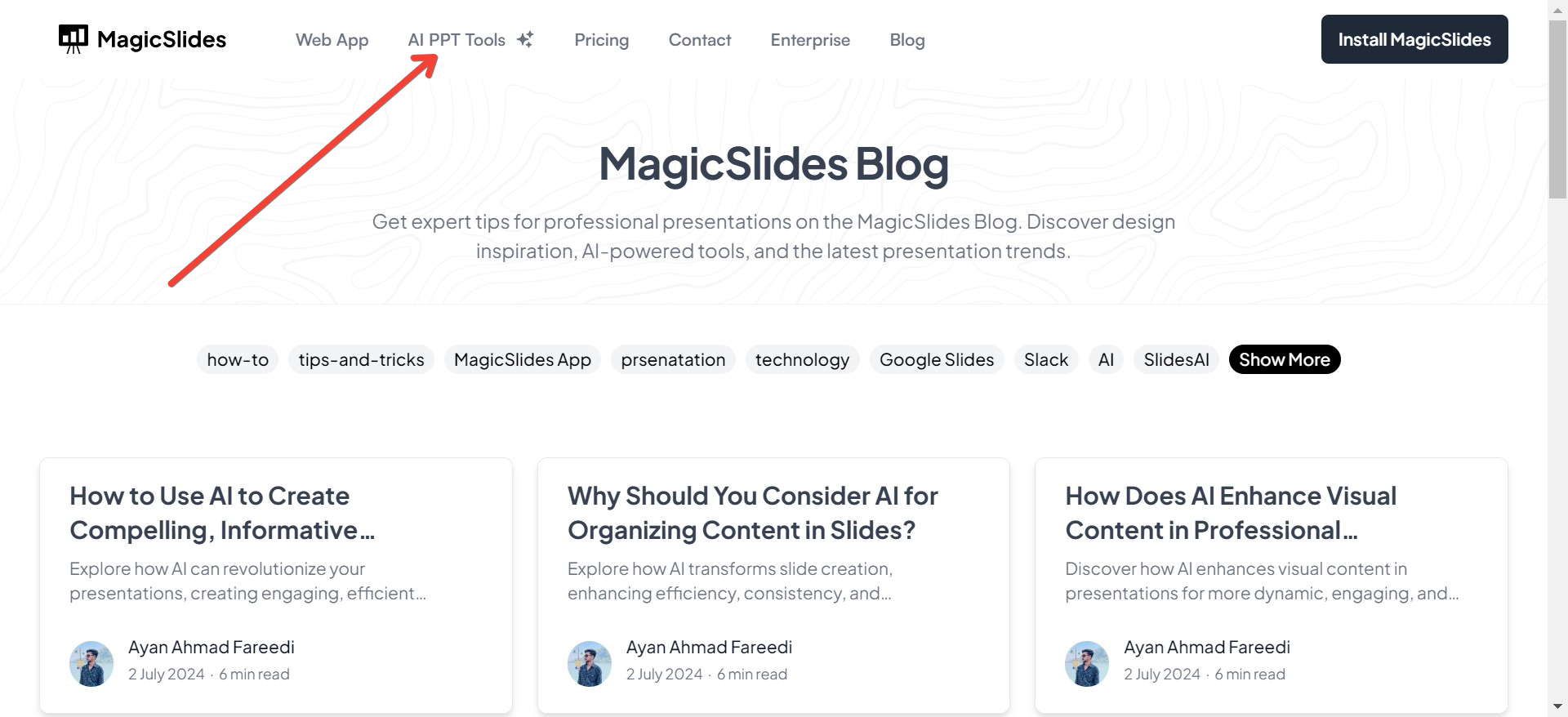 - Navigate to the Blog Page: Once on the homepage, locate and click on the ‘Blog’ page from the top navigation menu. On the Blog page, find and click on the article or section titled ‘AI PPT Tools’. This will provide you with insights and tools related to enhancing PowerPoint presentations using artificial intelligence.