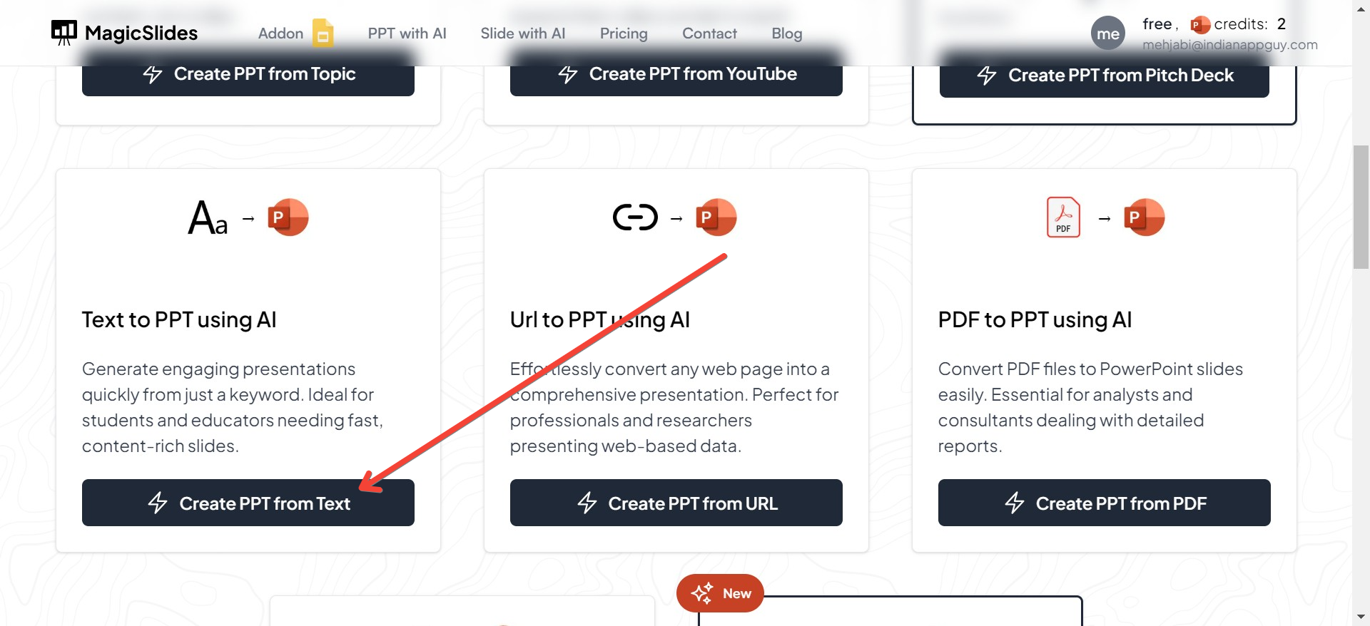 On the MagicSlides homepage, look for a section called "AI PPT Tools." This area contains different tools that use artificial intelligence to help you build your presentation. Click on this to move to the next step.