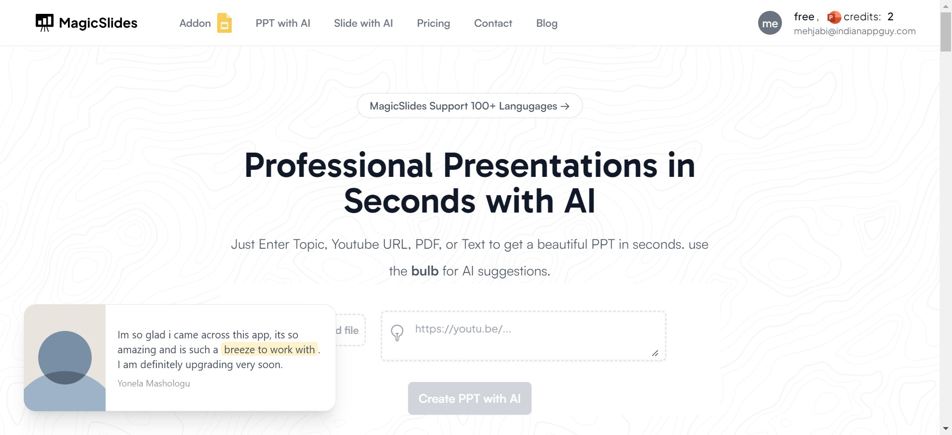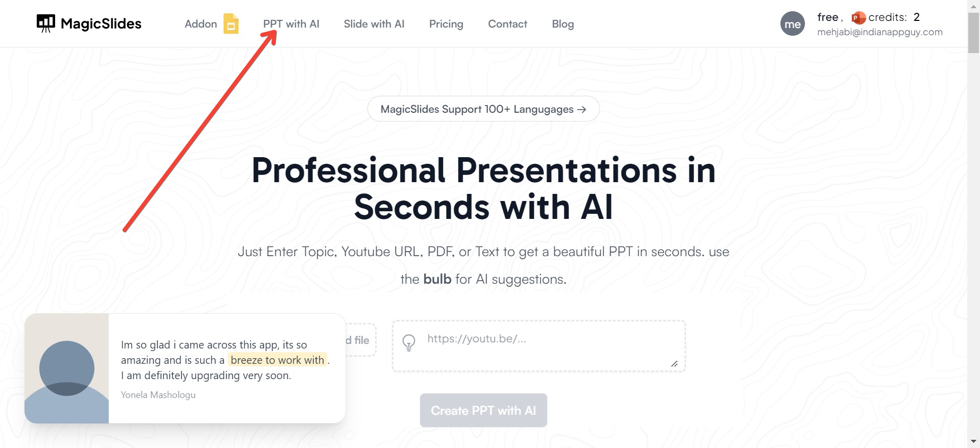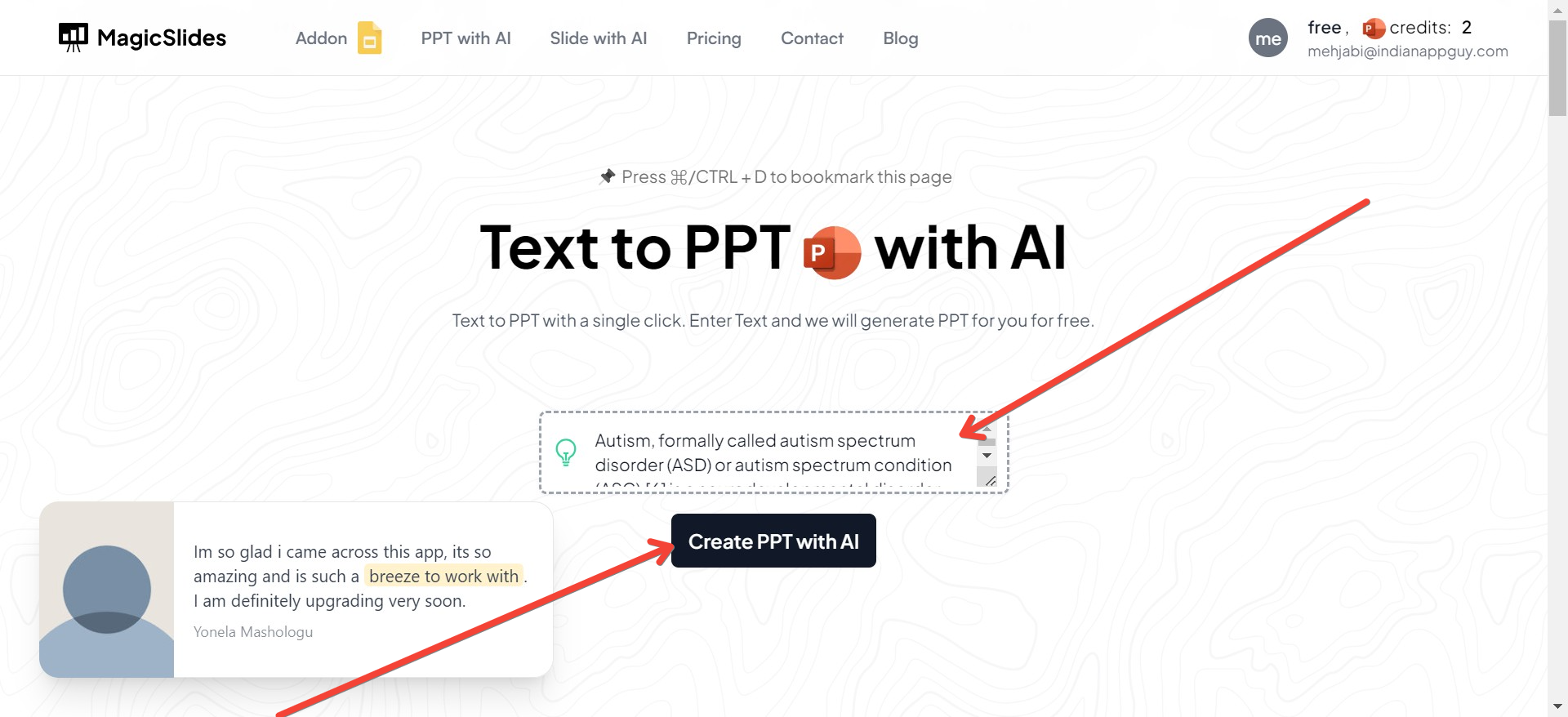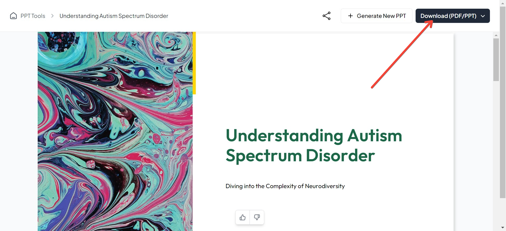 Click the "Generate PPT" button after you enter your text. MagicSlides.app will analyze your text and organize it into a PowerPoint presentation. This includes choosing a layout and style that makes your information clear and engaging.