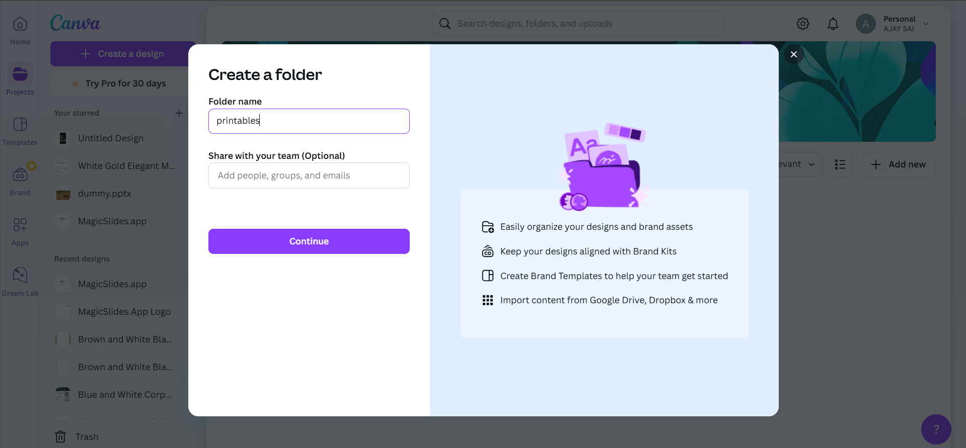 Create a new folder by clicking “+ Create a Folder” and give it a name (e.g., "Printables").