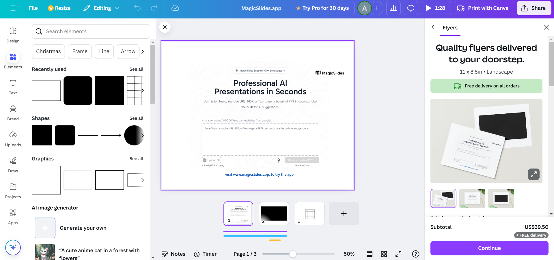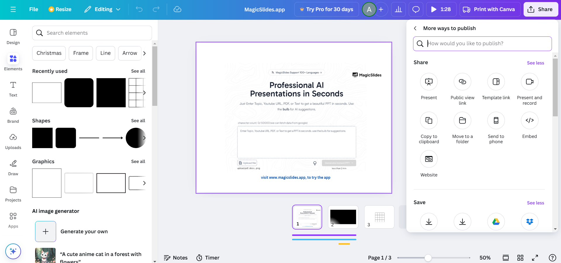 Use Canva’s templates, graphics, and text tools to create slides, posters, or interactive materials.