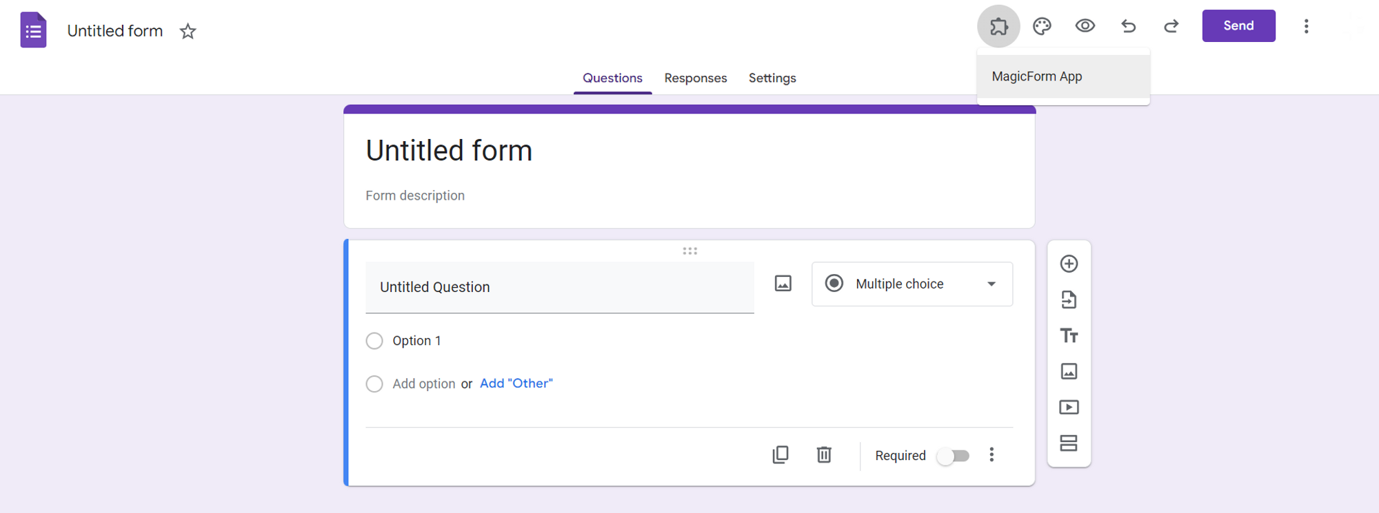 Launch Google Forms, and you'll find MagicForm accessible in the extensions tab. Click on it to open the addon.