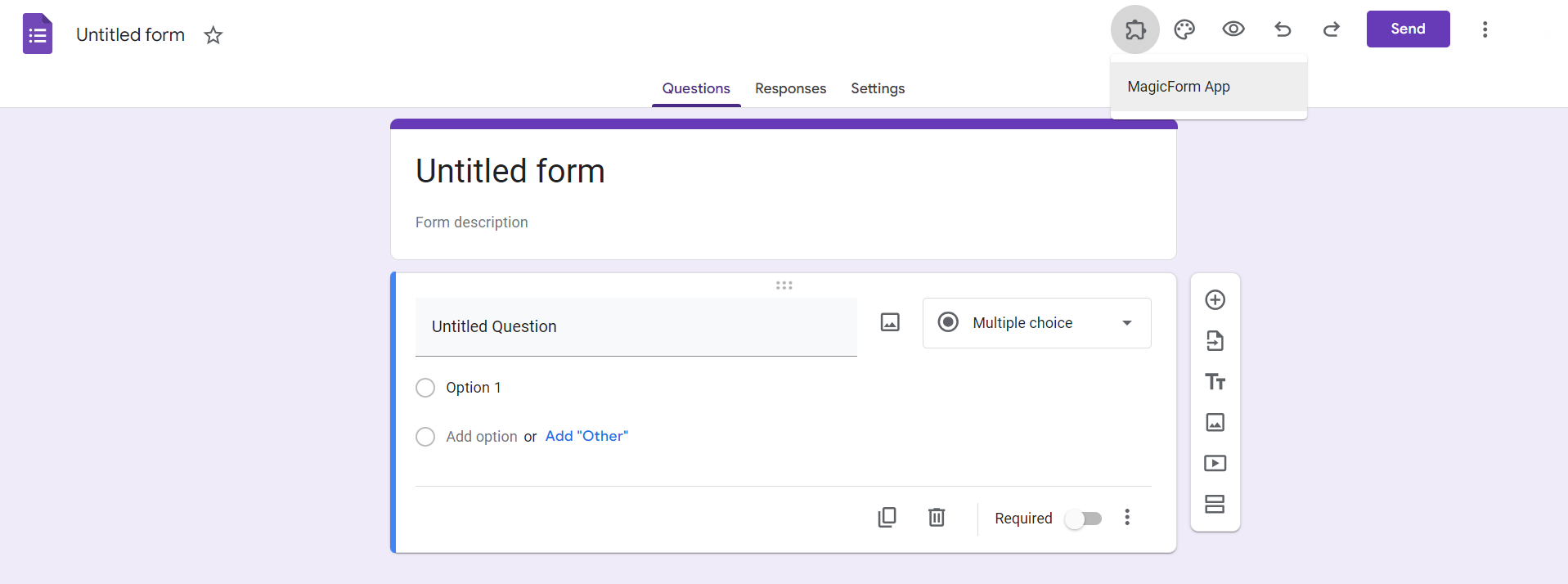 Step 2: Integration with Google Forms Once installed, MagicForm becomes a visible extension within Google Forms, a widely used platform for creating surveys and assessments. This integration streamlines access to MagicForm's AI-driven capabilities.