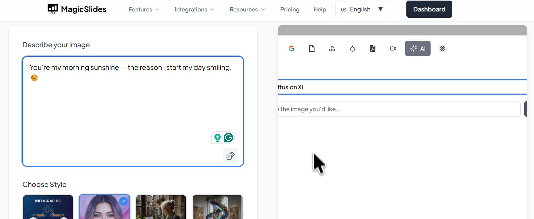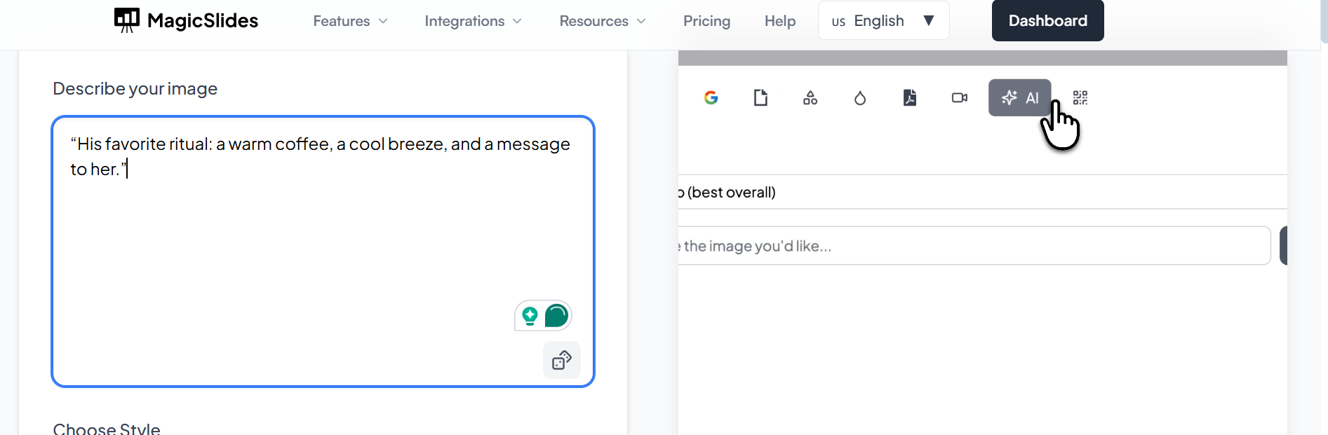 “With MagicSlides’ AI image generator, you can instantly create high-quality images from text prompts — perfect for adding meaningful visuals to your romantic good morning messages or presentation content.”