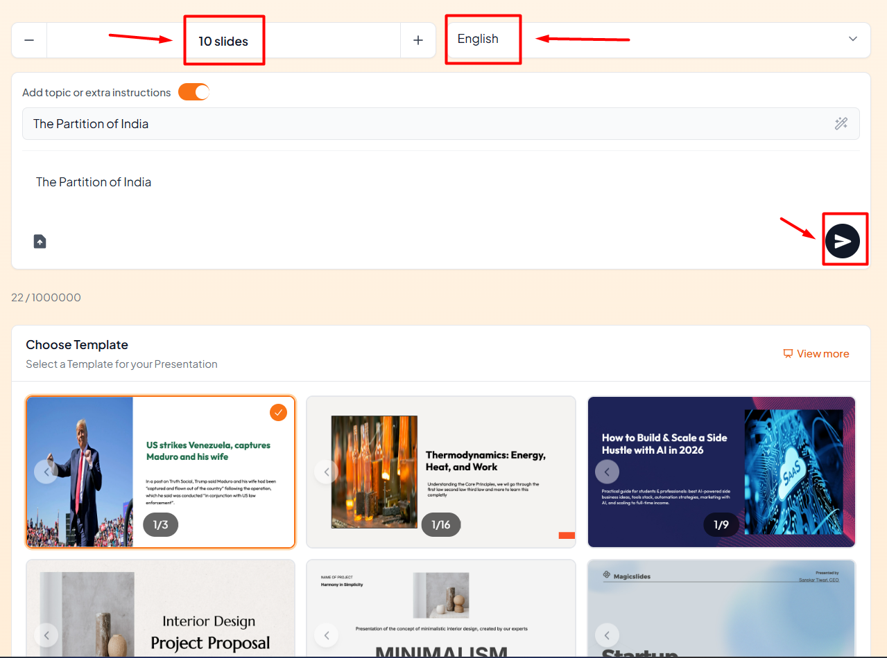 Step 2. Enter the topic in the Presentation Topic Box. Since we have chosen this topic - The Partition of India, let’s move forward with it.