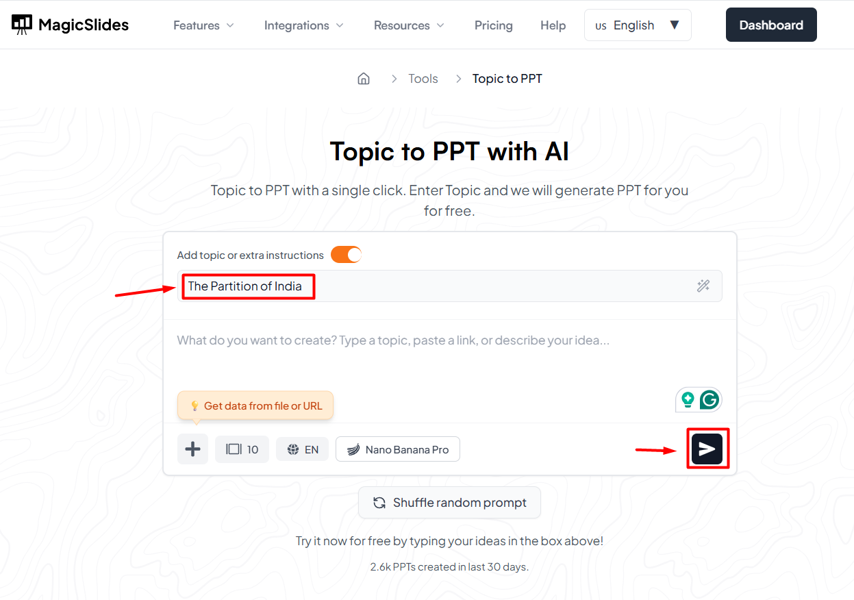 Once you have decided on a history presentation topic, you can use MagicSlides’ AI Presentation Maker tool. It only requires you to enter the topic and click on generate. That’s all you will get your PPT instantly.