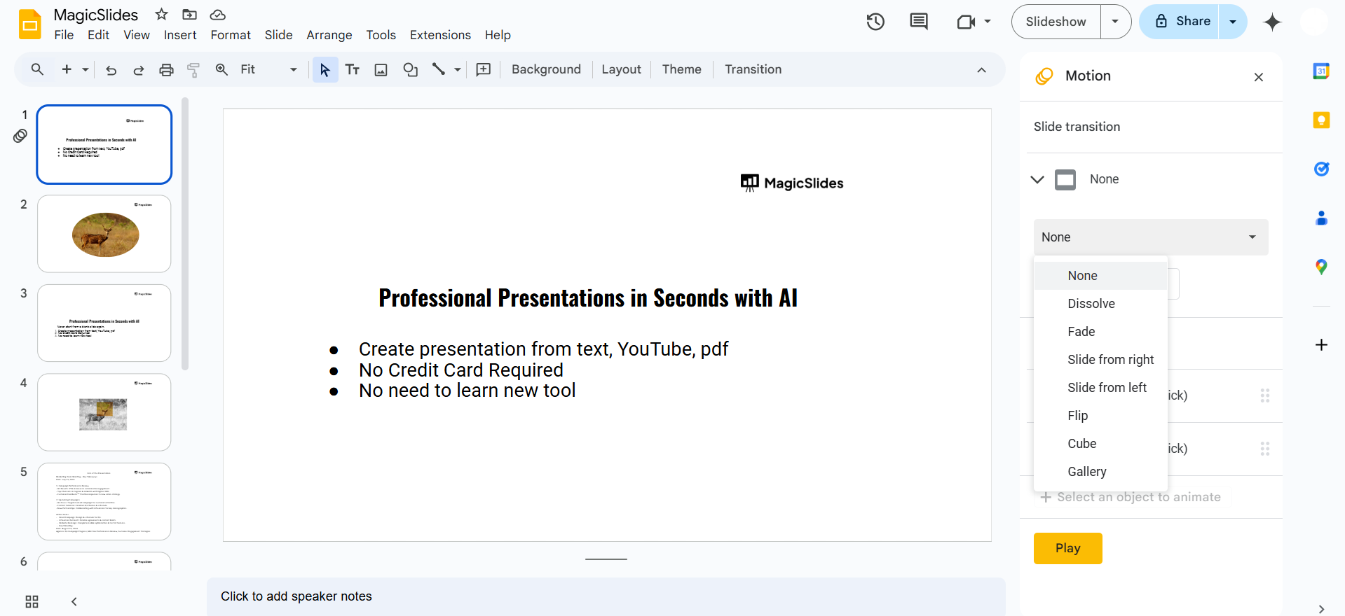 To animate the transition between slides, select "Slide transition" in the Motion sidebar.