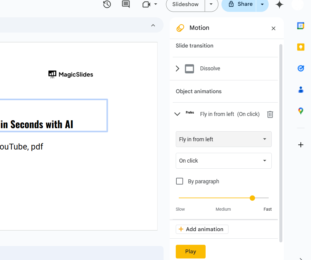 Click the "Play" button in the Motion sidebar to preview the animations for the current slide.