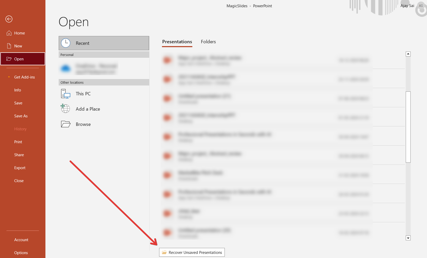 Go to File > Open > Recover Unsaved Presentations to browse for unsaved or auto-recovered files.