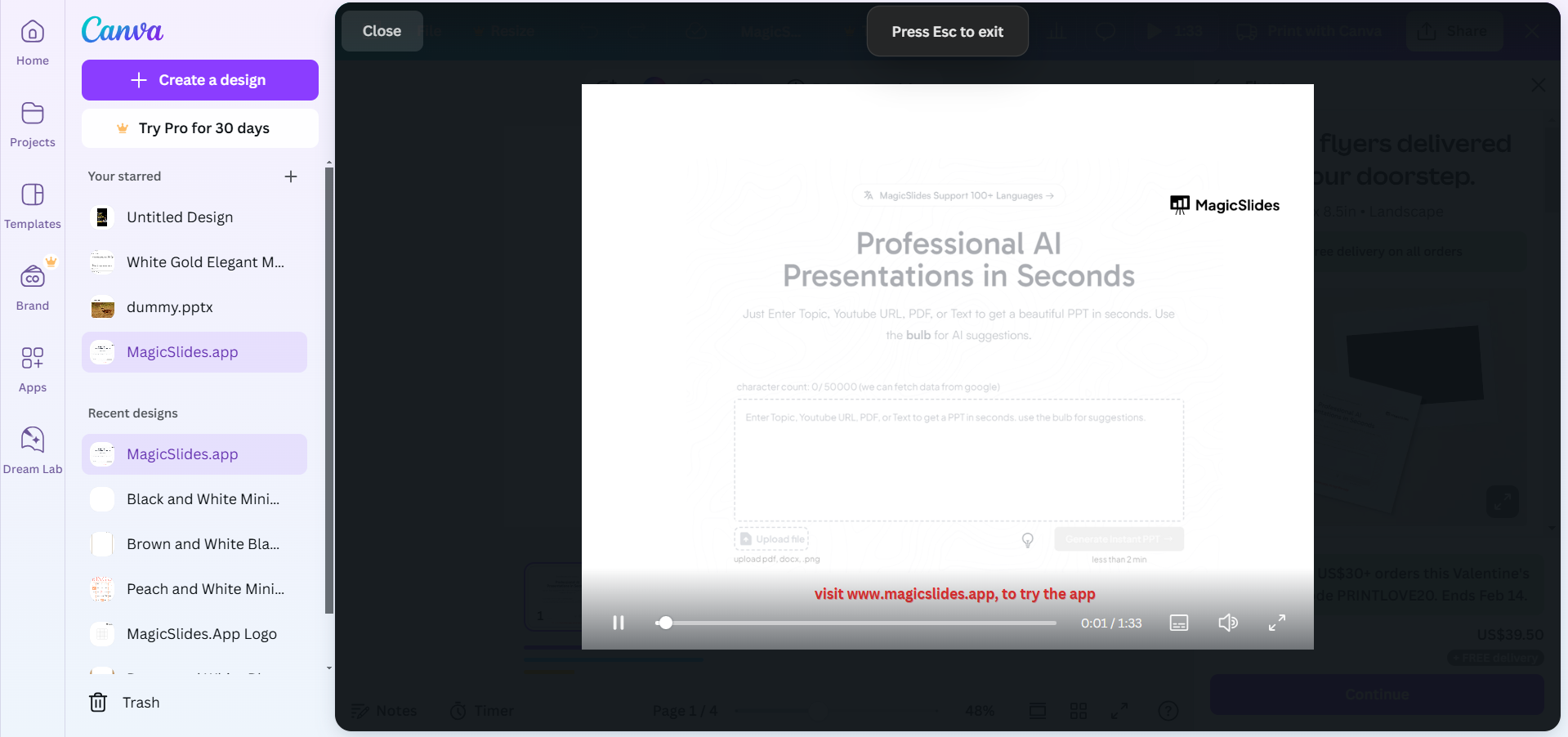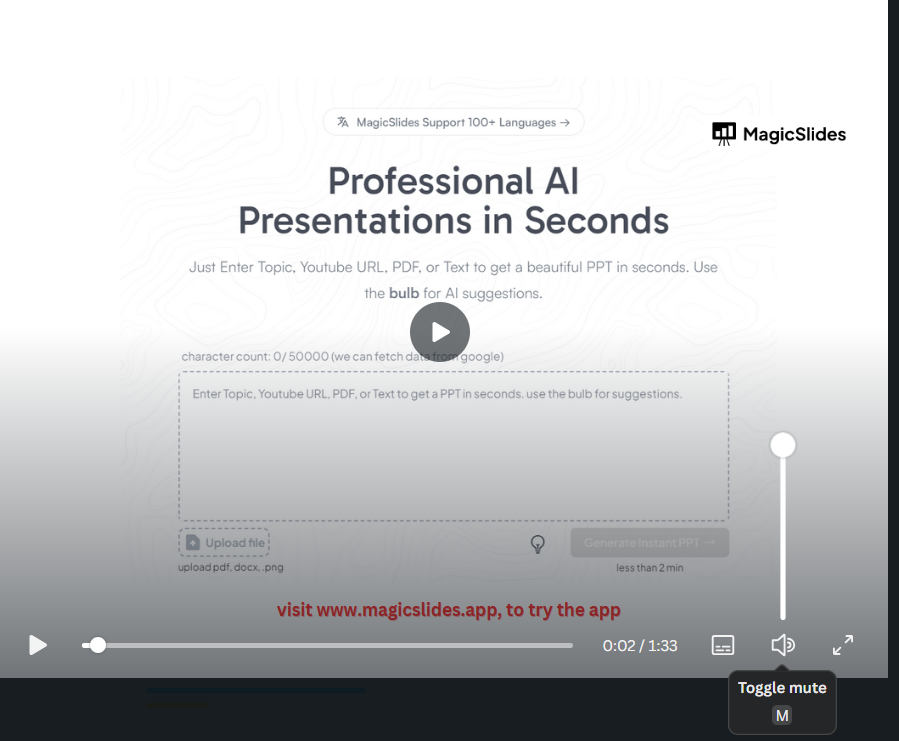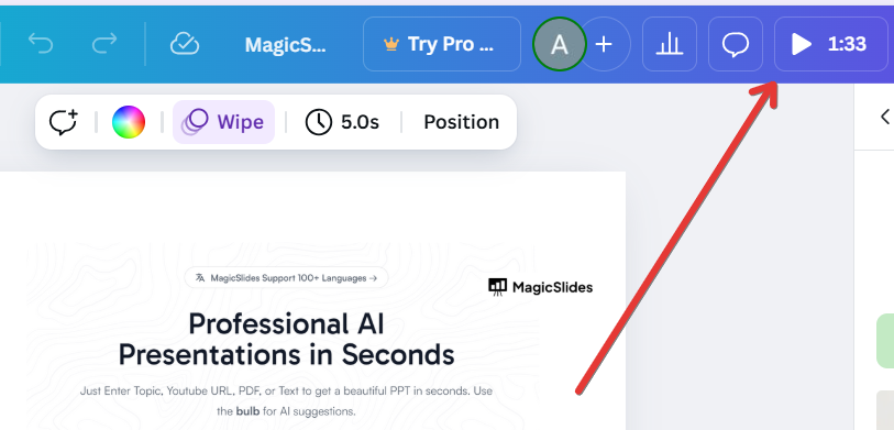 Exploring Canva’s presentation settings is useful, but if you need a quicker way to create professional slides, check out MagicSlides.app. Generate complete presentations from topics, PDFs, or even YouTube videos in seconds!