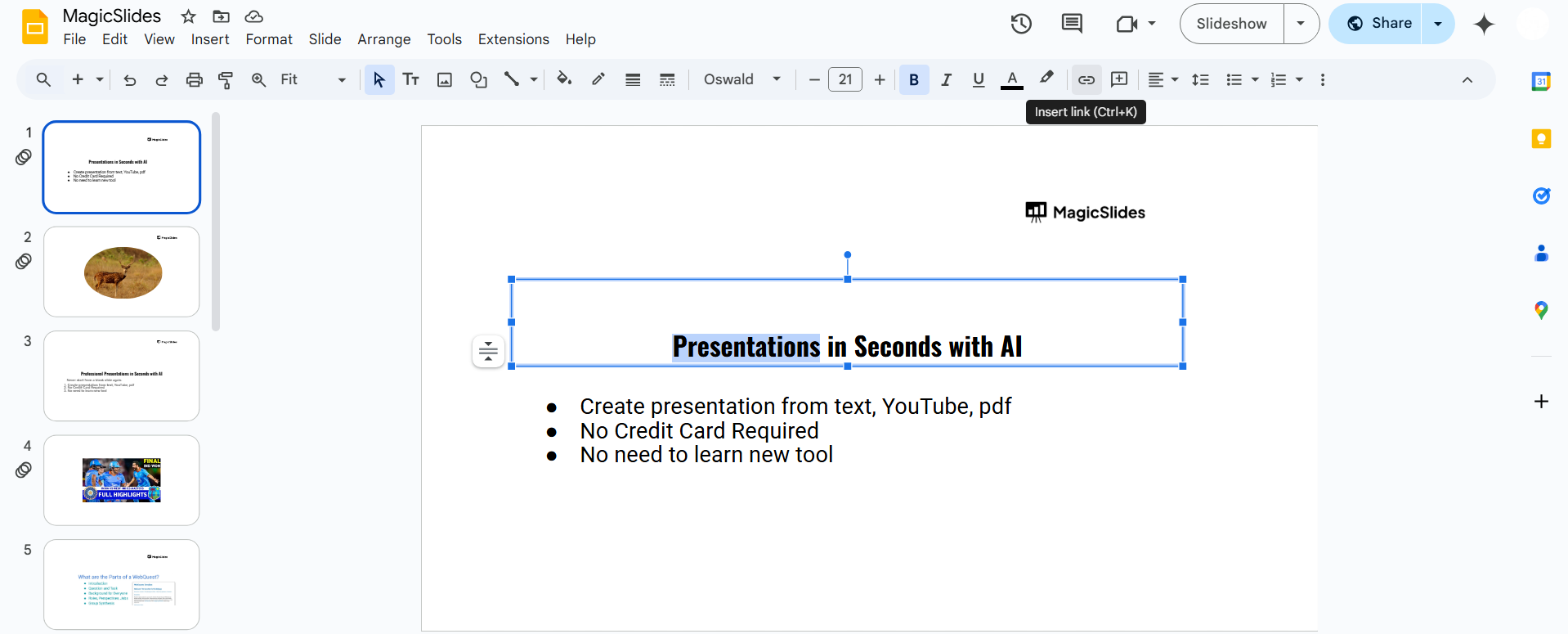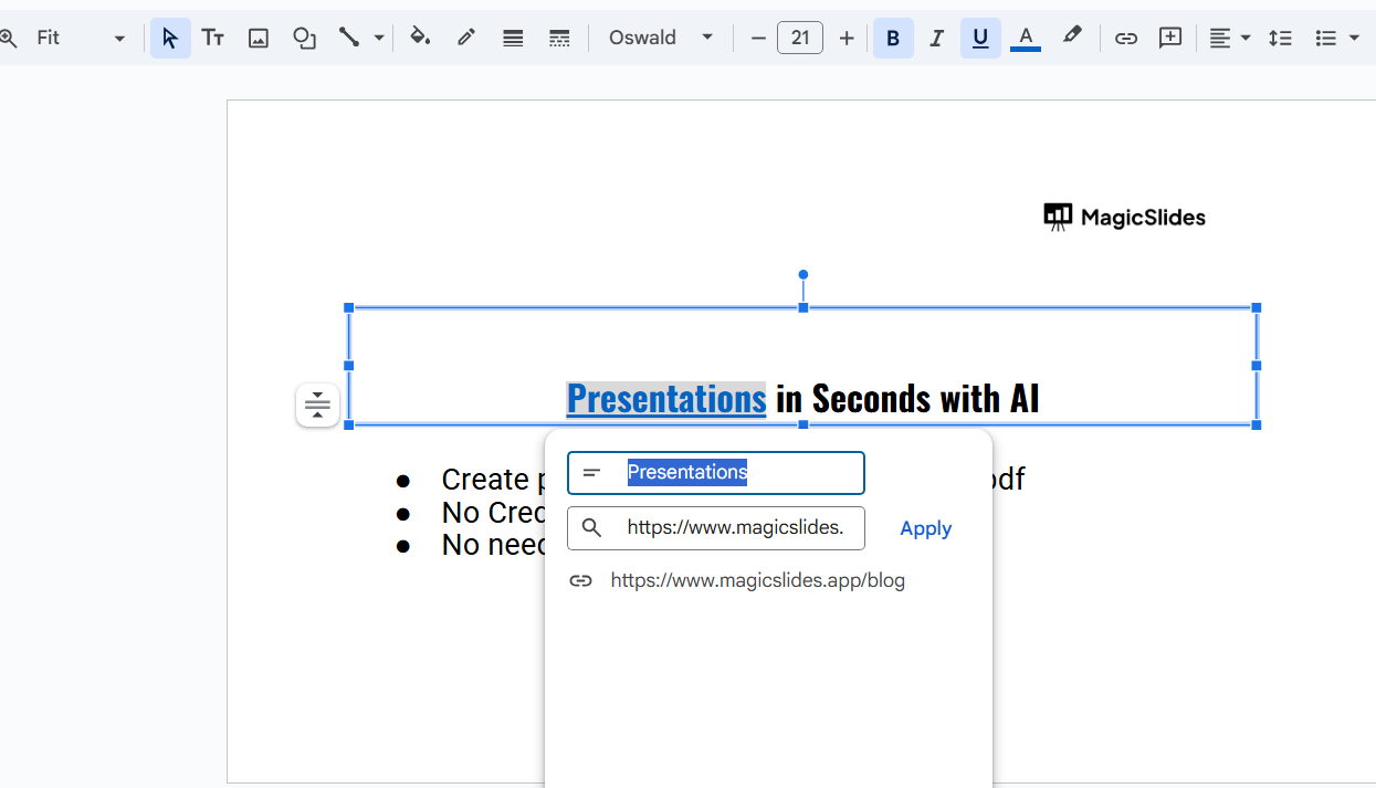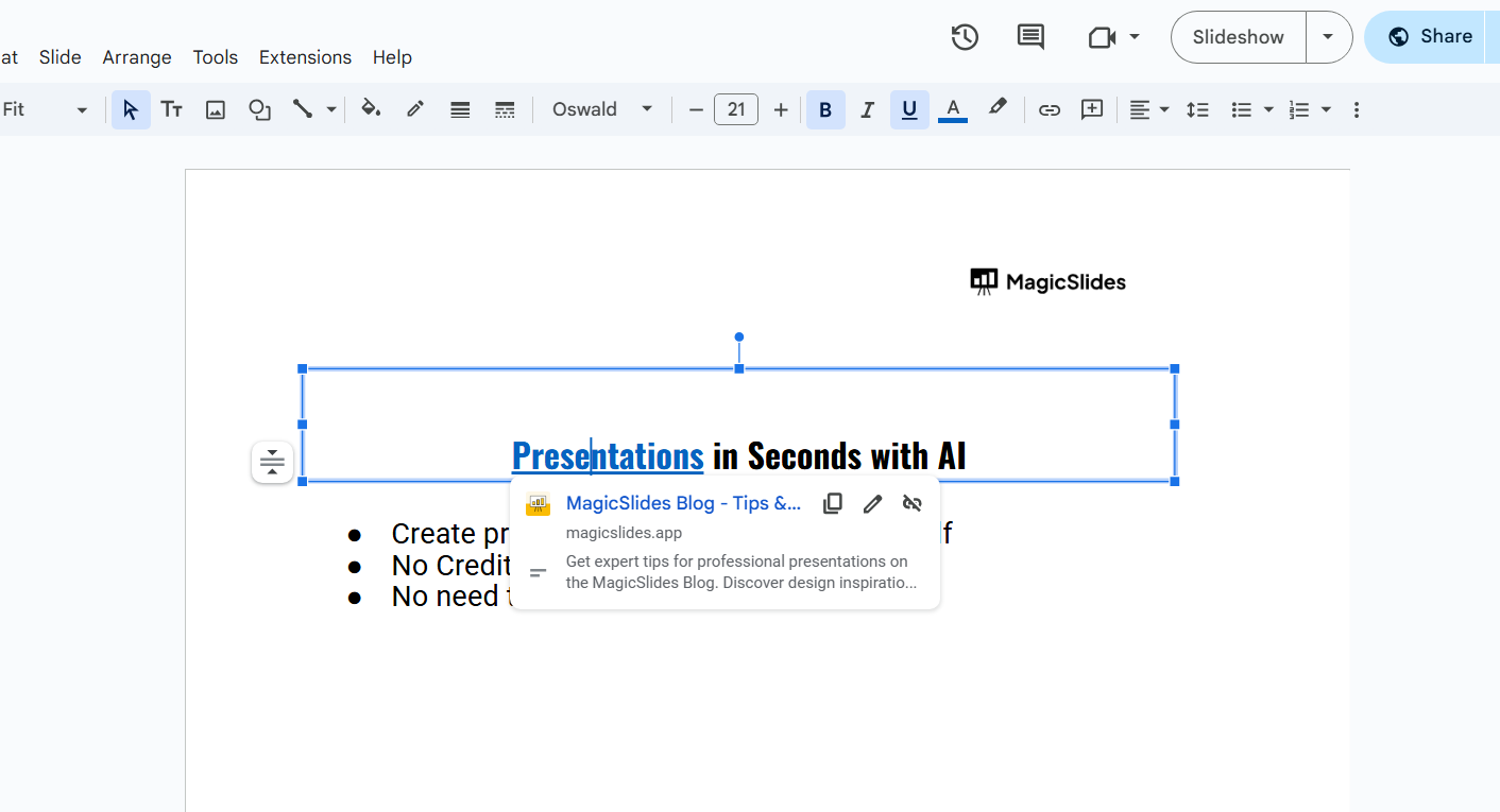 Adding links improves navigation in Google Slides, but if you need a smarter way to create fully structured slides, check out MagicSlides.app AI-generated presentations in just a few clicks!
