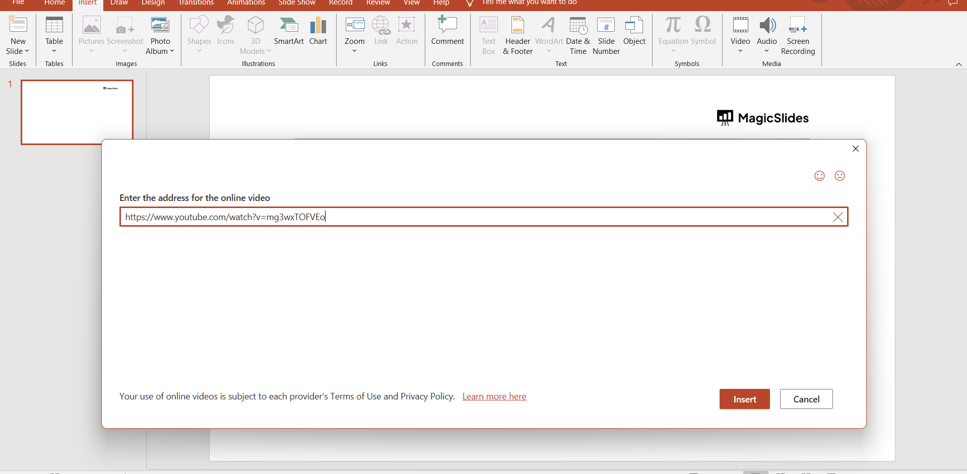 Step 6: Click "Insert": After entering the search terms or pasting the embed code, click the "Insert" button. PowerPoint will connect to the internet, search for the video, and insert it into your slide.