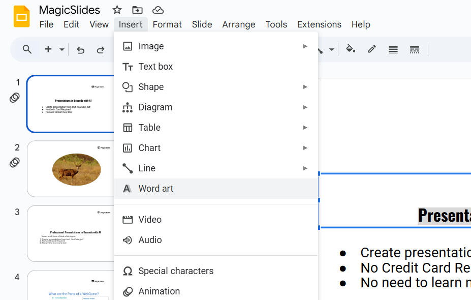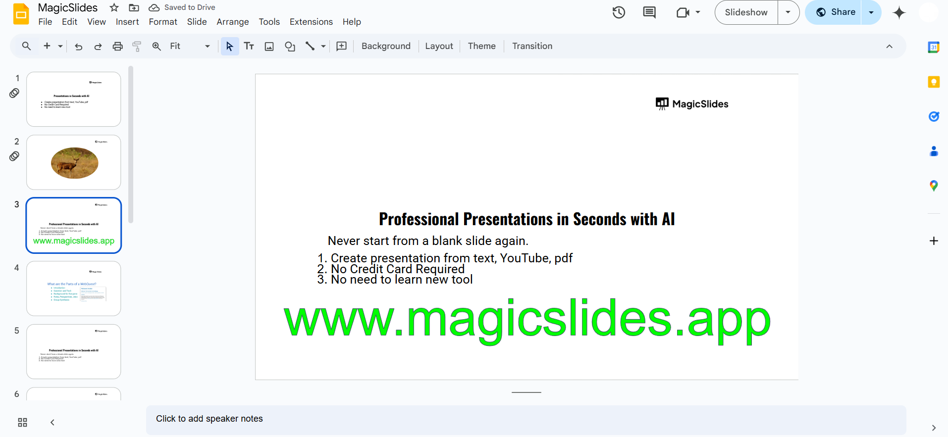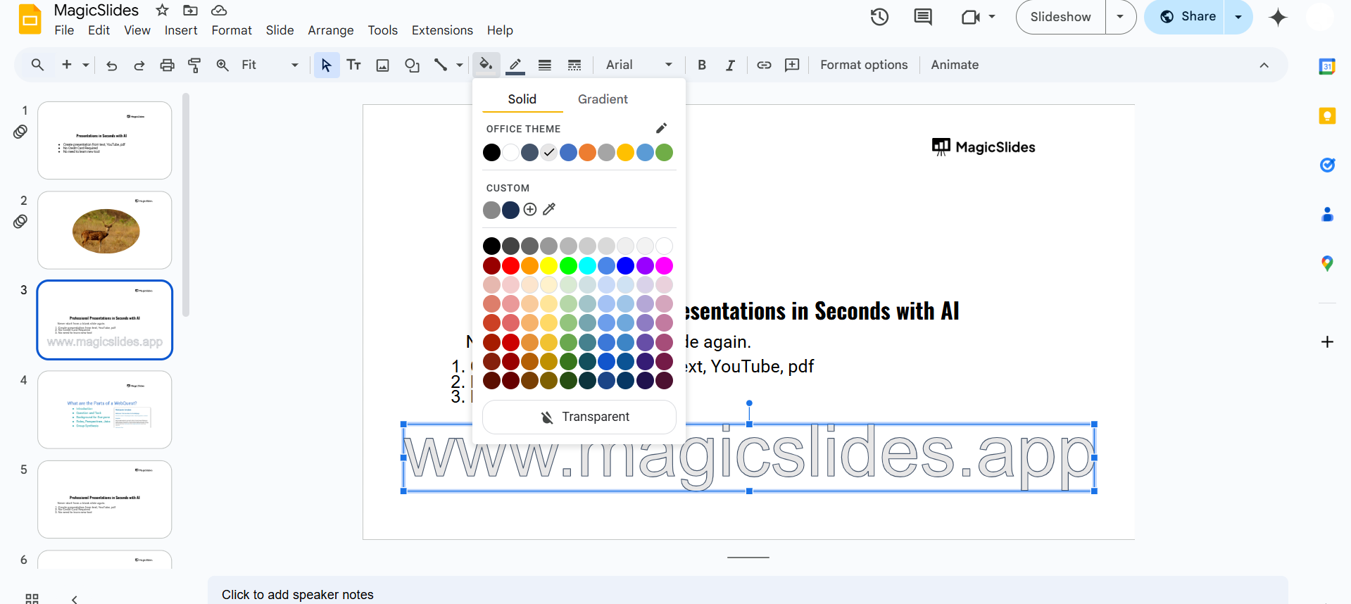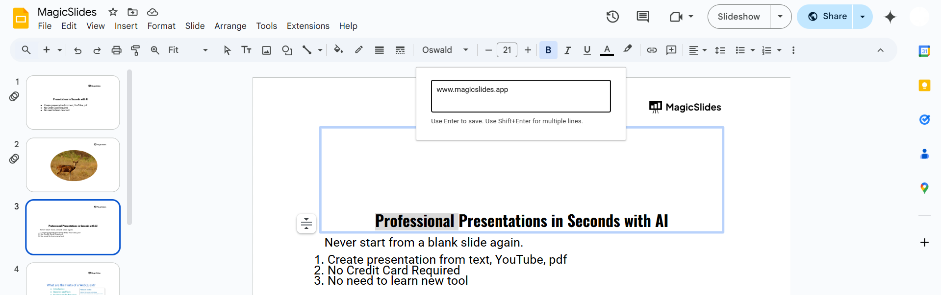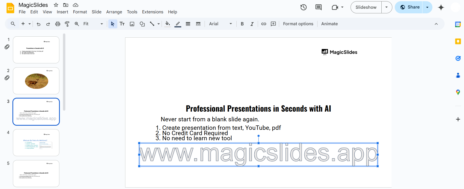 Outlining text in Google Slides can make your content stand out, but why stop there? With MagicSlides.app, you can create visually stunning, AI-powered presentations effortlessly, complete with well-formatted text and design!