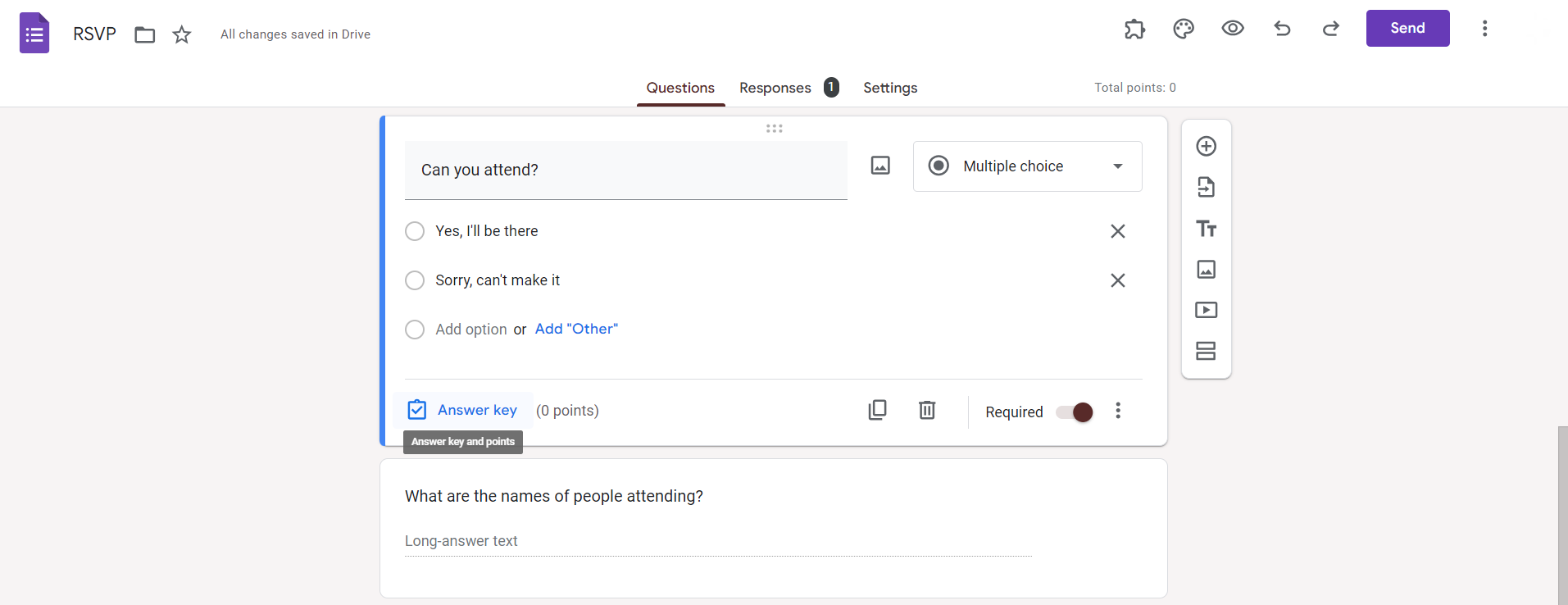 After adding questions, click on the "Answer Key" button located at the top of the form editor. This button resembles a small grid.