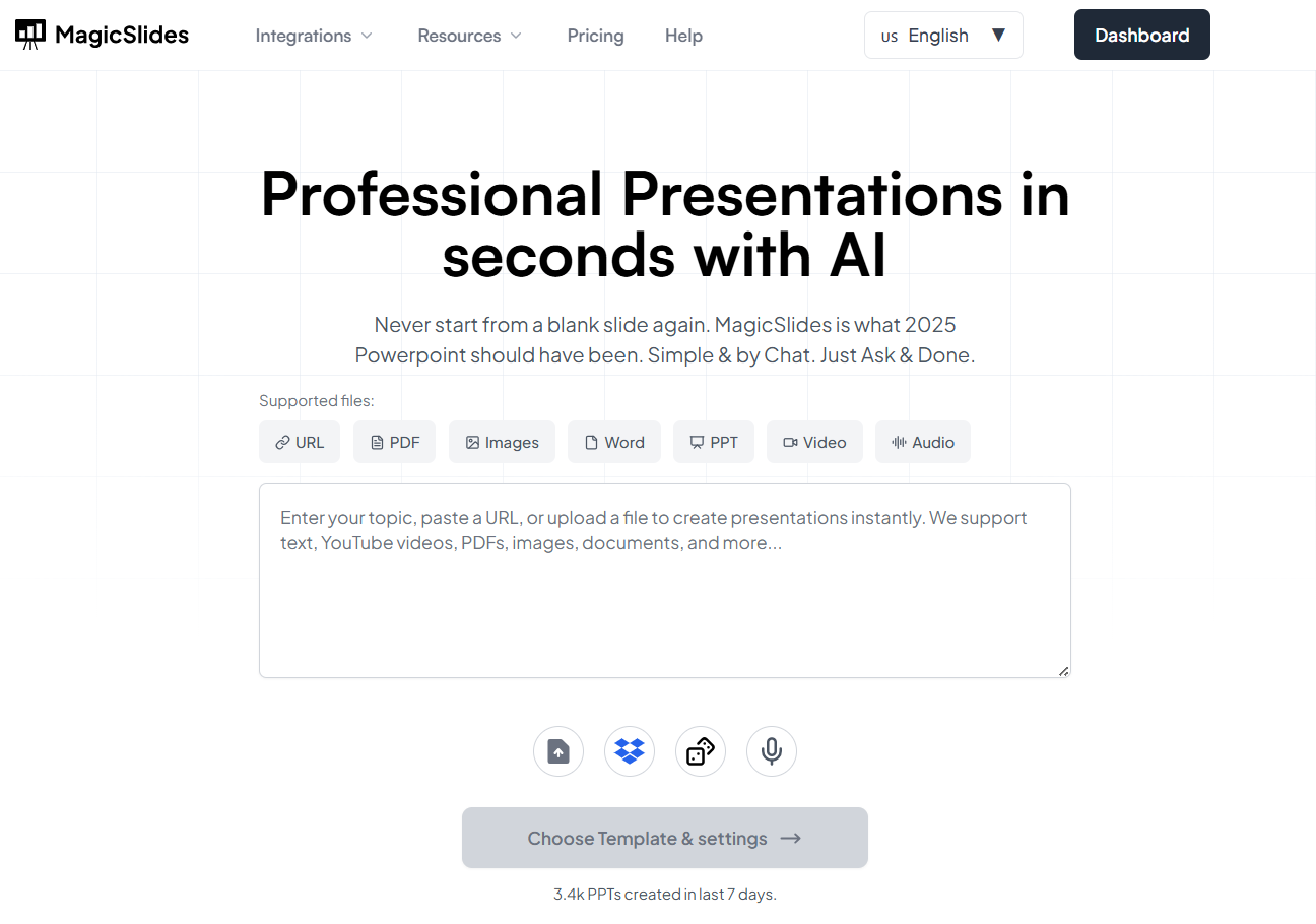 - Automatically create professional presentations from text or topics.
