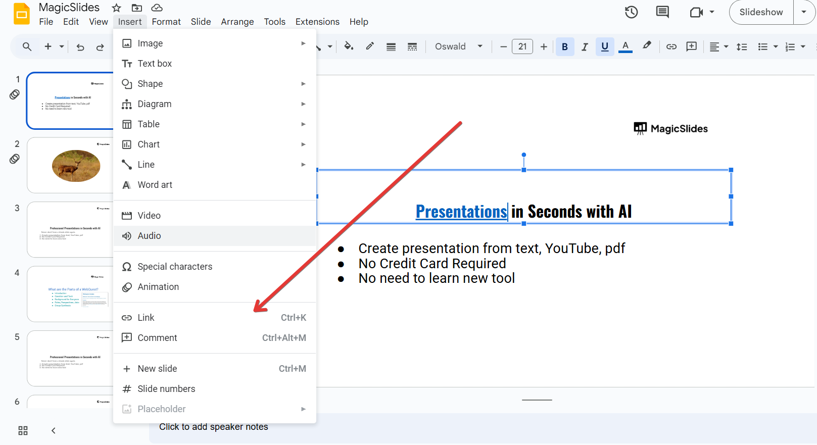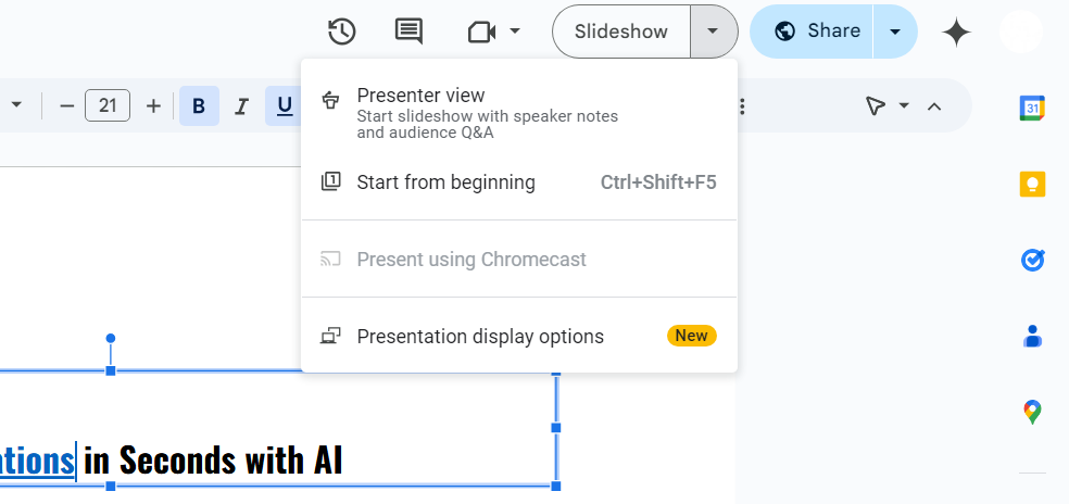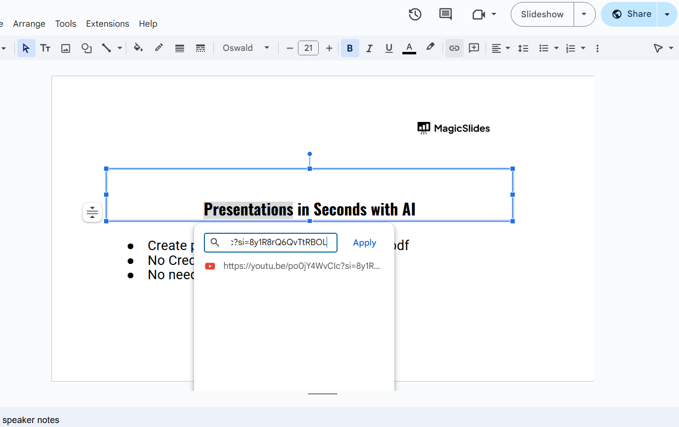 Want to enhance your Google Slides with continuous background music? Once you've set it up, take your presentations further with MagicSlides.app, where AI helps you create visually engaging and professional slides instantly!