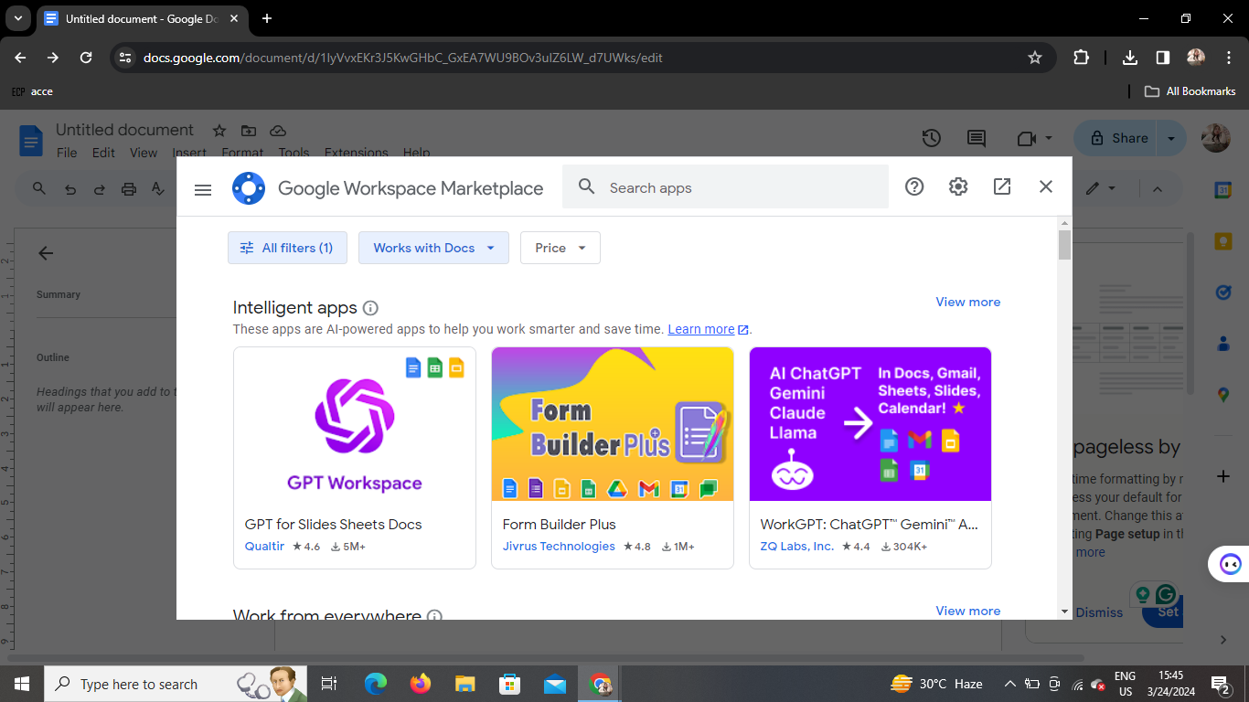 A small window will appear, displaying various add-ons available for Google Docs. You can browse through the featured add-ons or use the search bar to find specific extensions.
