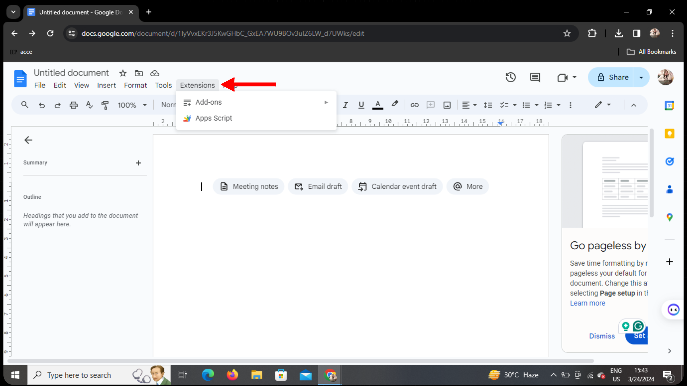 Once you're in Google Docs, look for the "Extensions" menu in the top toolbar. It's located between "Tools" and "Help". Click on it to reveal a dropdown menu.