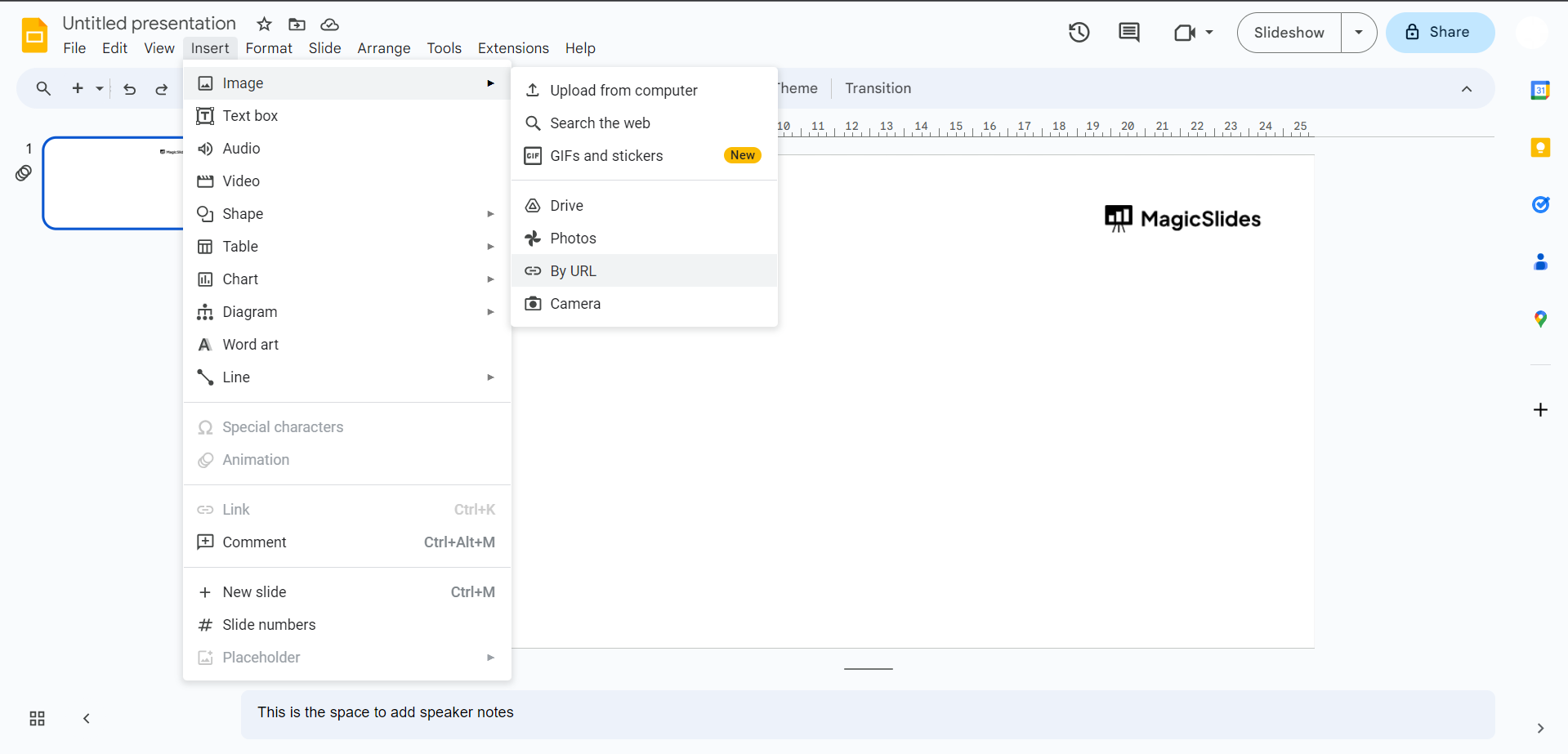 Navigate to the "Insert" menu and choose "Image." Opt for the "By URL" option, signaling your intent to add an image via a URL.