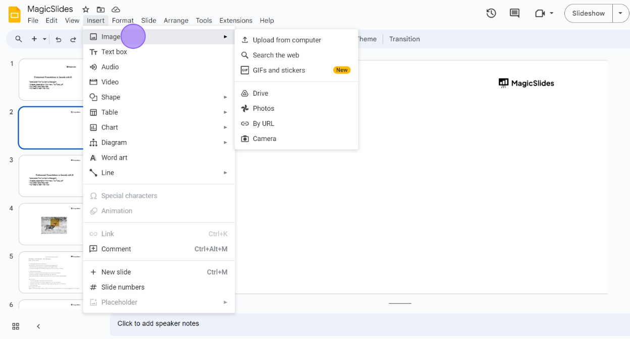 Once you're on the desired slide, click on the "Insert" menu at the top of the screen.