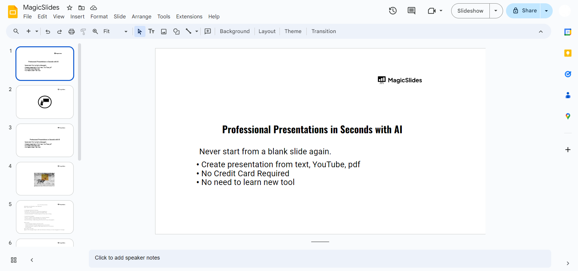 Once you're logged in, either create a new presentation by clicking on the "+" button or open an existing presentation from your Google Drive.