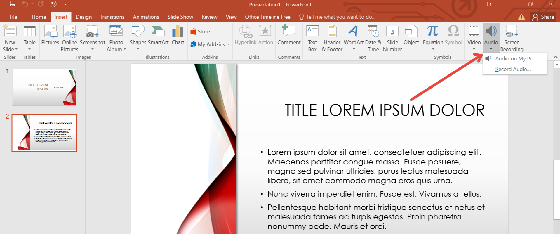 Click on the "Audio" option within the "Insert" tab. From the dropdown menu, select "Audio on My PC" if you have the music file saved locally, or choose "Online Audio" to insert music from an online source.