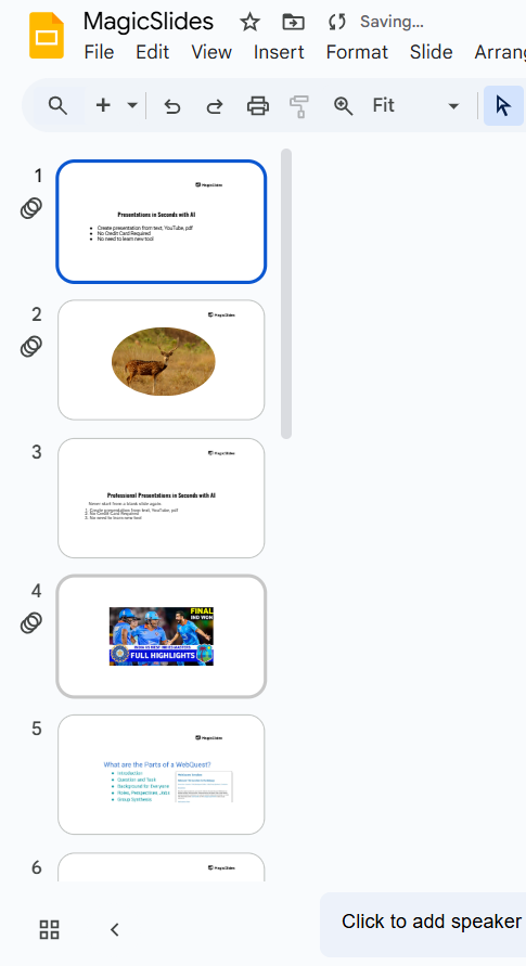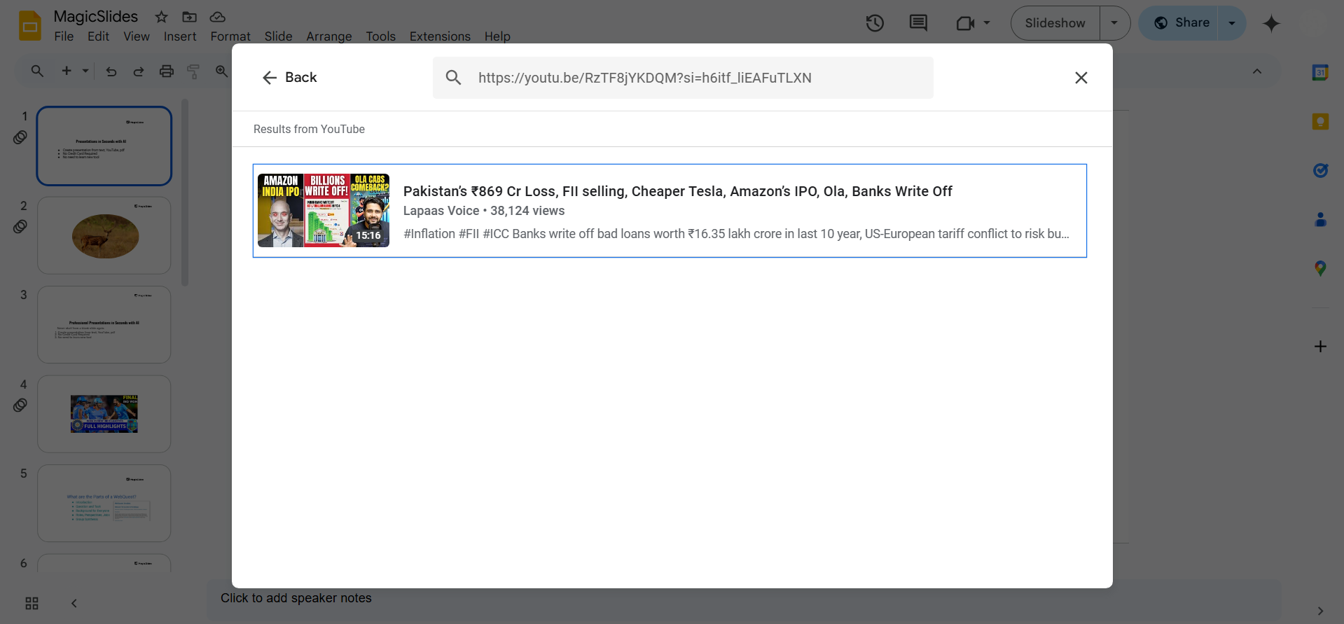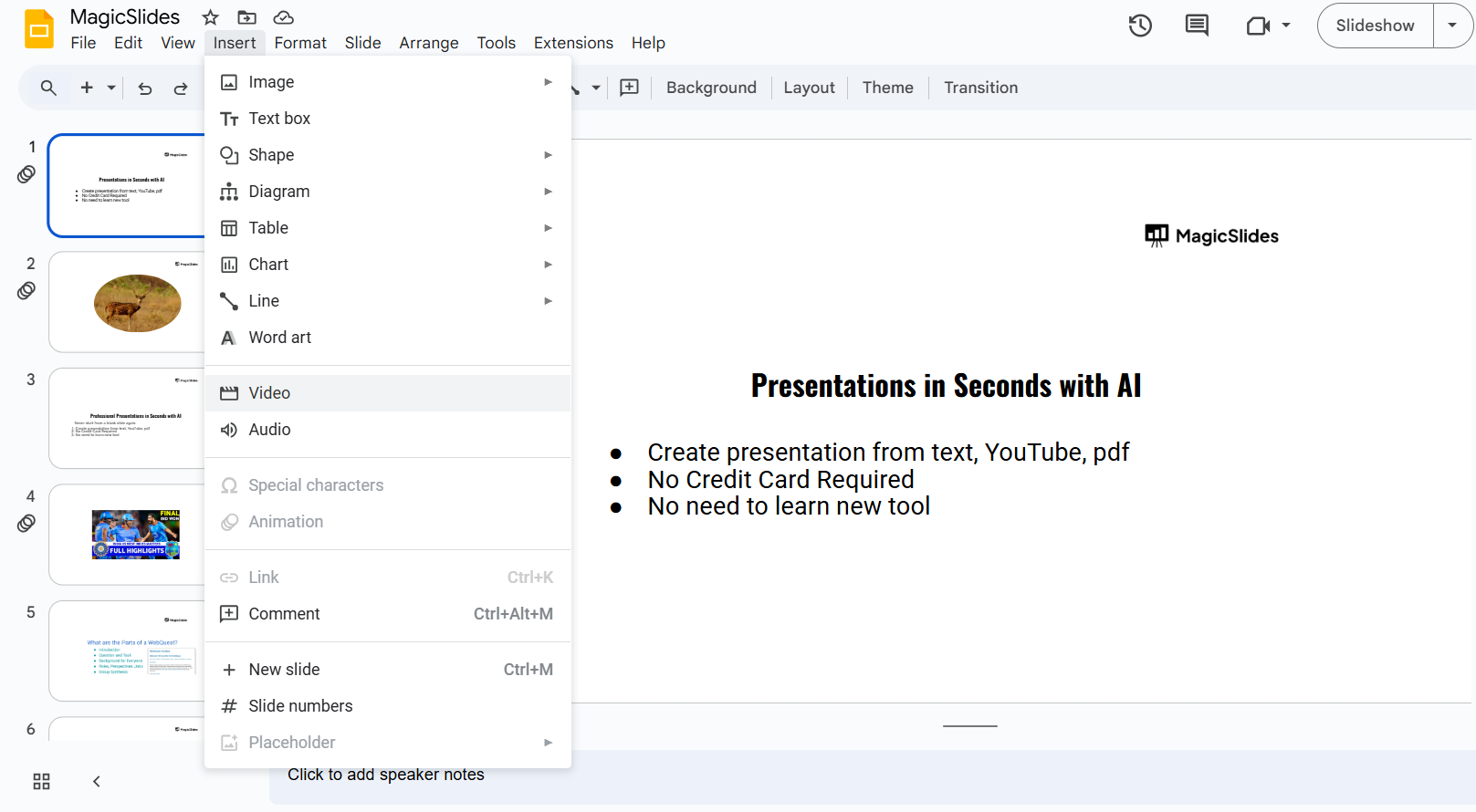 Inserting your own videos in Google Slides enhances presentations, but why not let AI handle the slide creation for you? With MagicSlides.app, generate professional presentations instantly from any topic or video URL!