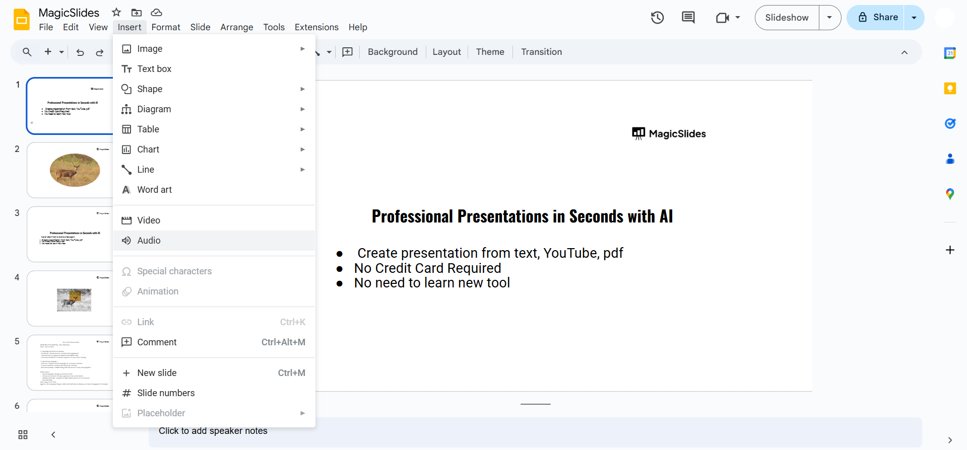 Go to your Google Slides presentation, navigate to the slide where you want to add narration, and select “Insert” from the menu bar.