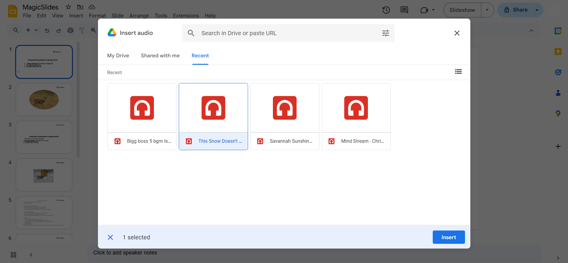 Choose “Audio,” and a menu will appear with your audio files from Google Drive. Select the relevant audio file for the slide, then click “Select” to add it.